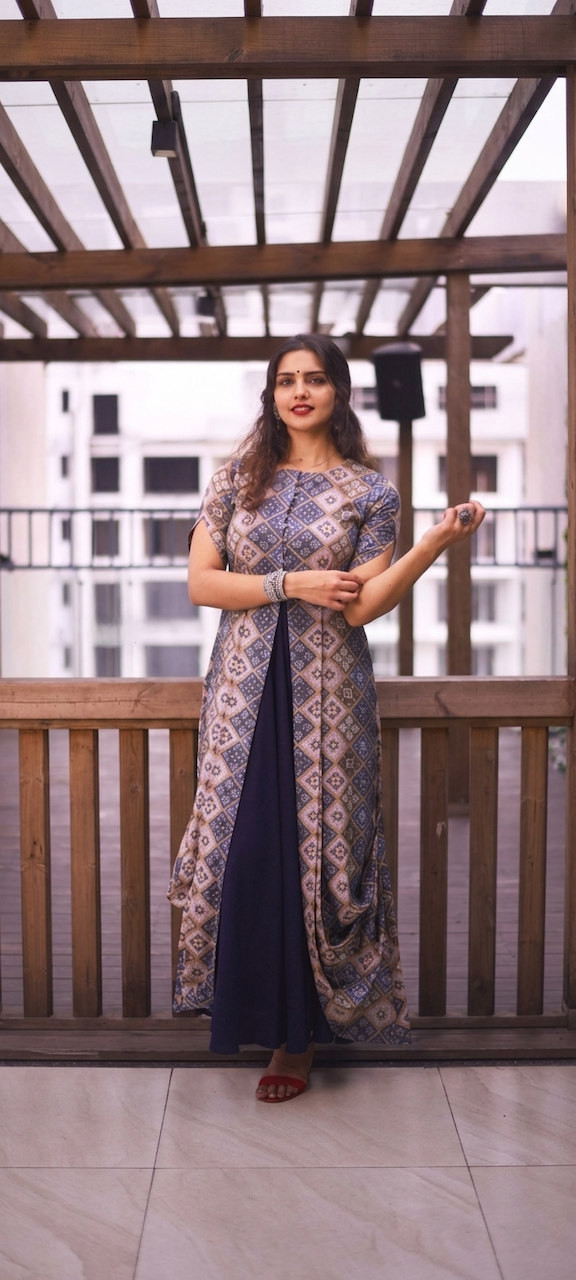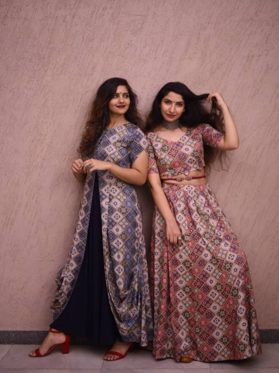 The Noor dress from our Inaaya collection is a two-piece set of the sleeveless dress with our signature draped jacket in traditional bandhej and gold foil prints. Adorned with cowl draped pleats and loop details, Noor is perfect for this festive season!