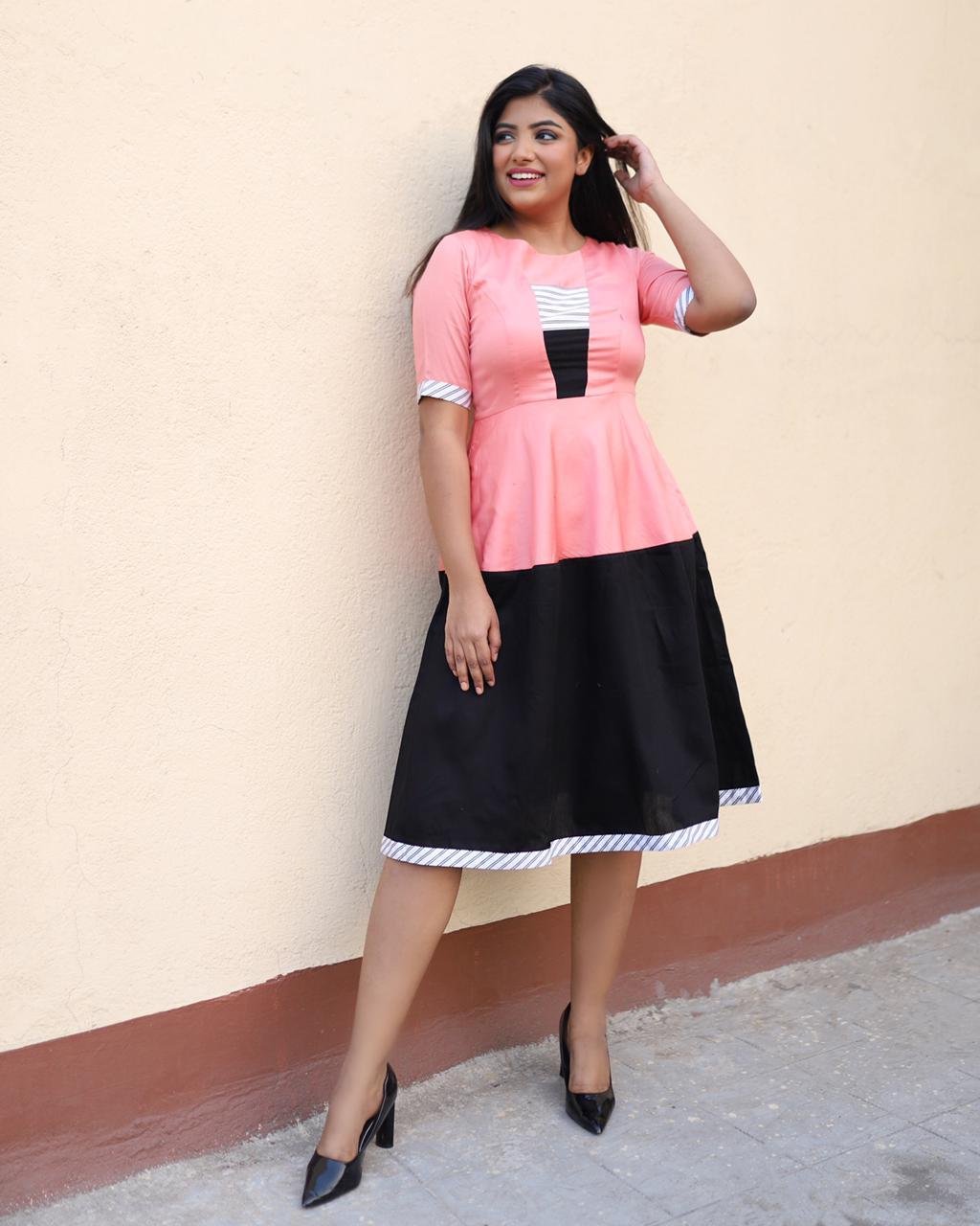 The dress features a flattering peach base complemented by a contrasting striped panel and dark accents.
