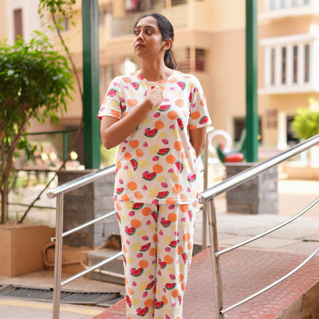 Brighten your lounge time with our Multicolor Fruit Pop Women’s Cotton T-shirt & Pant Set, designed with vibrant fruit prints for a playful yet cozy look. Made from breathable cotton, this women’s nightwear ensures all-day comfort, making it perfect as sleepwear, home wear, or casual lounge wear. Fresh, fun, and super-soft — your go-to for cheerful nights and relaxed mornings.