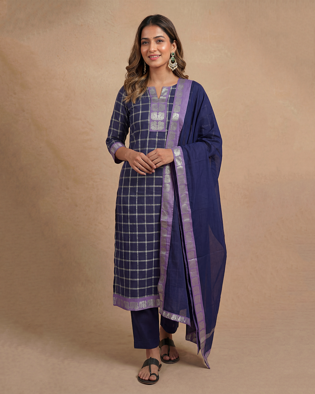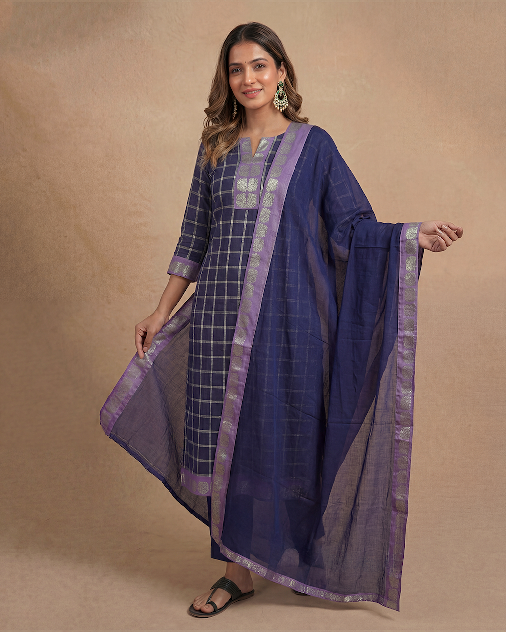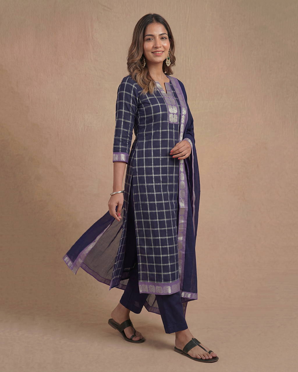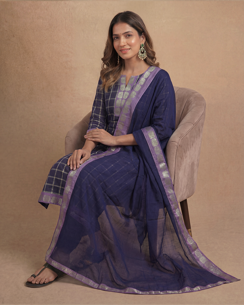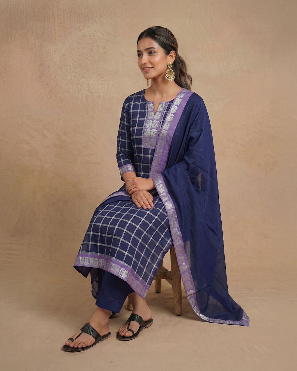 Navy Check Chungidi With Lavender Peacock Border Kurta Set With Dupatta