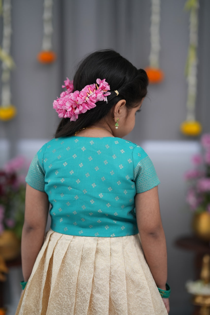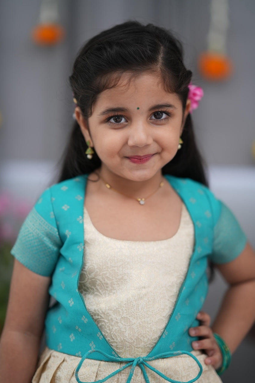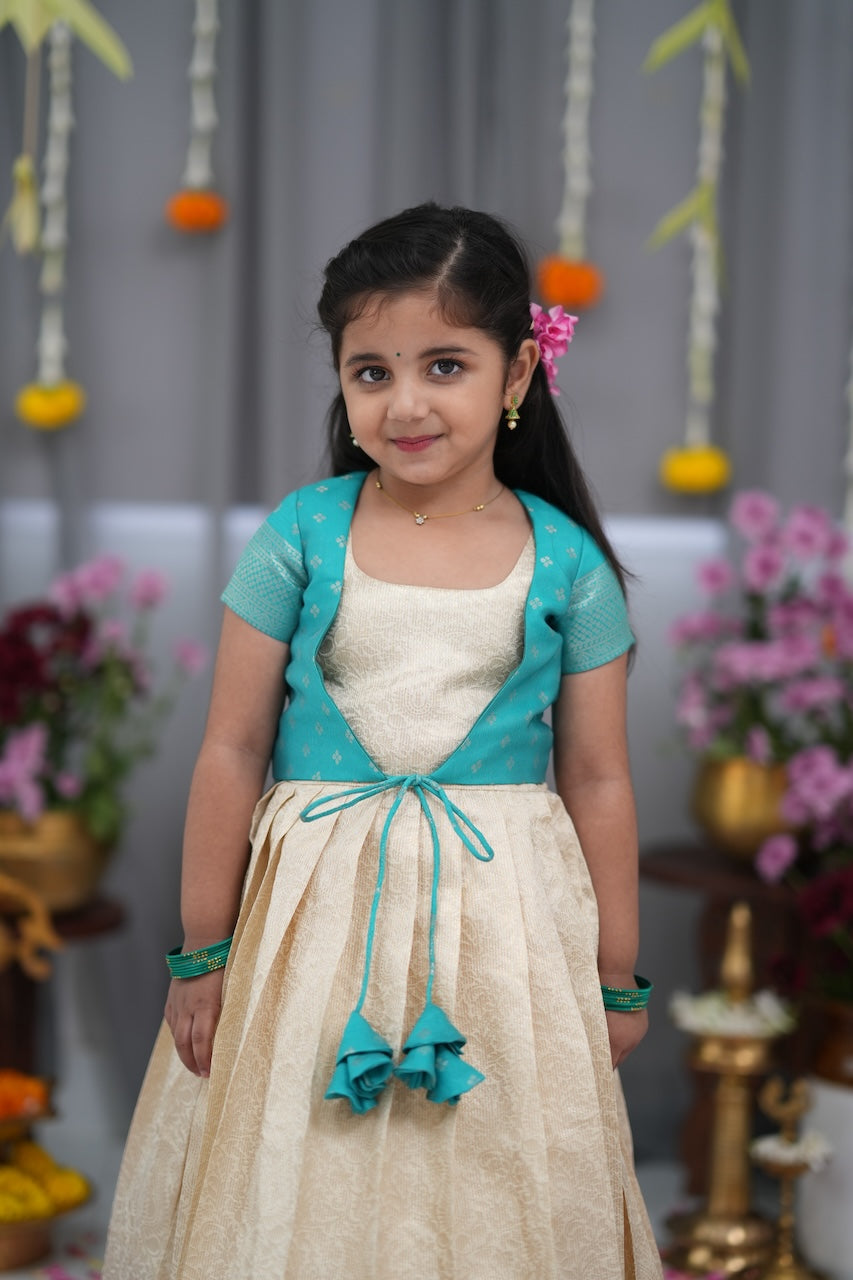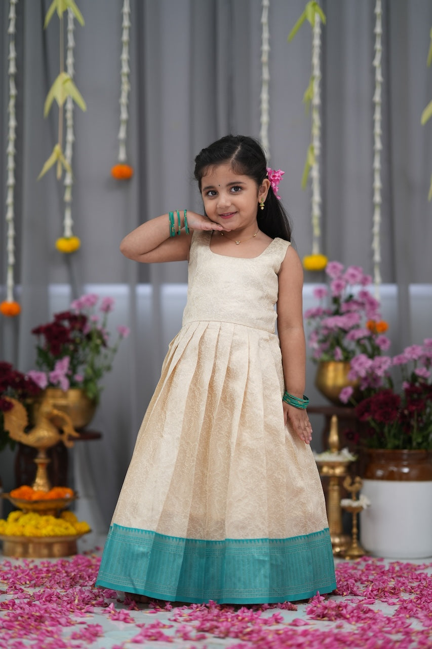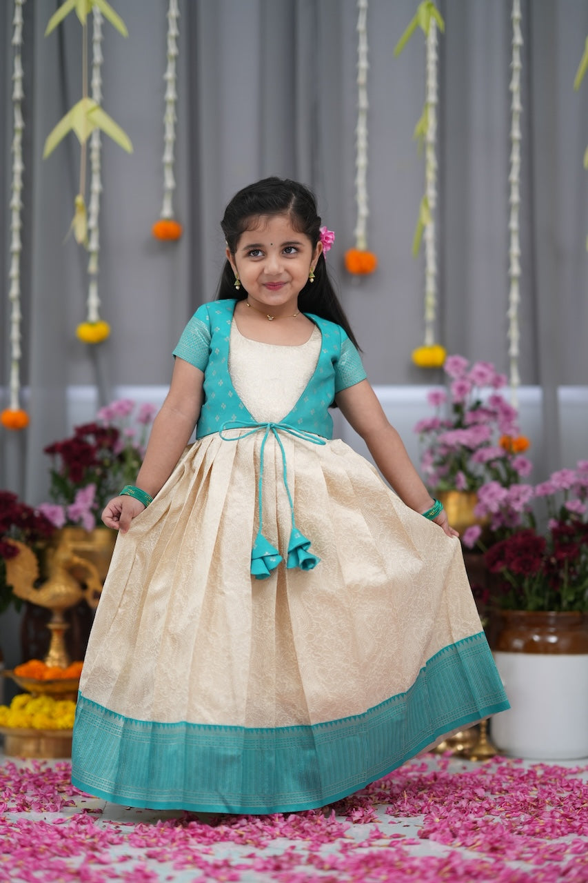 Teal Green & Off White Blended Silk Long Gown