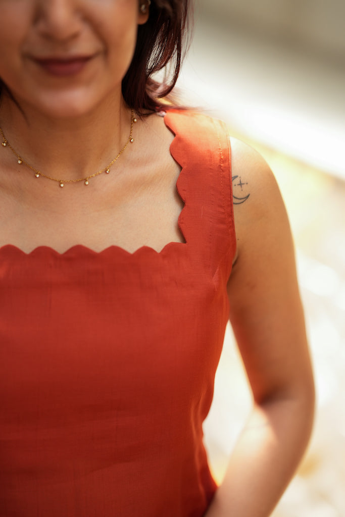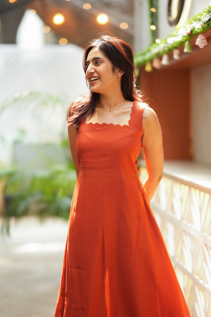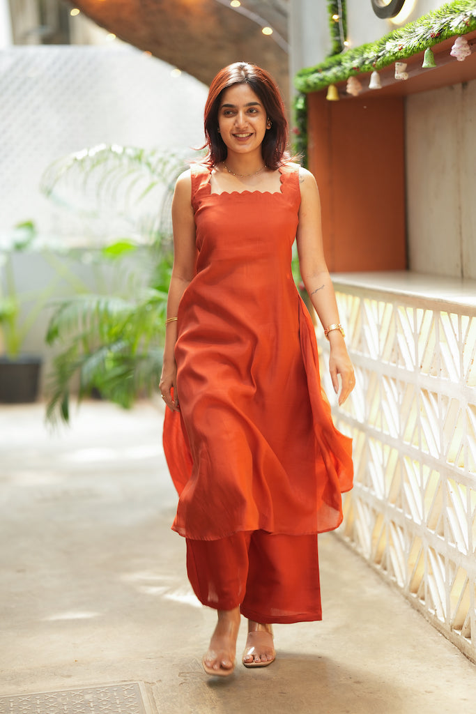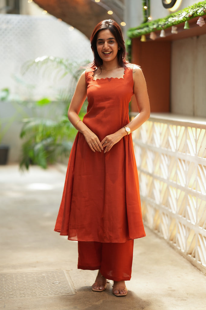 Meet the set that gives you that chic “Western dress” look while still feeling rooted in effortless Indian comfort. The Aarna Rust Orange Kurta Set is crafted in breathable mul cotton with a sleek, gentle sheen and a statement scalloped square neckline that instantly elevates the silhouette. The flowy kurta pairs with roomy palazzo pants for an easy, flattering fall—perfect for airport looks, resort stays, brunch plans, and warm-weather travel when you want to look polished without trying too hard.