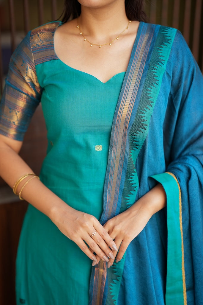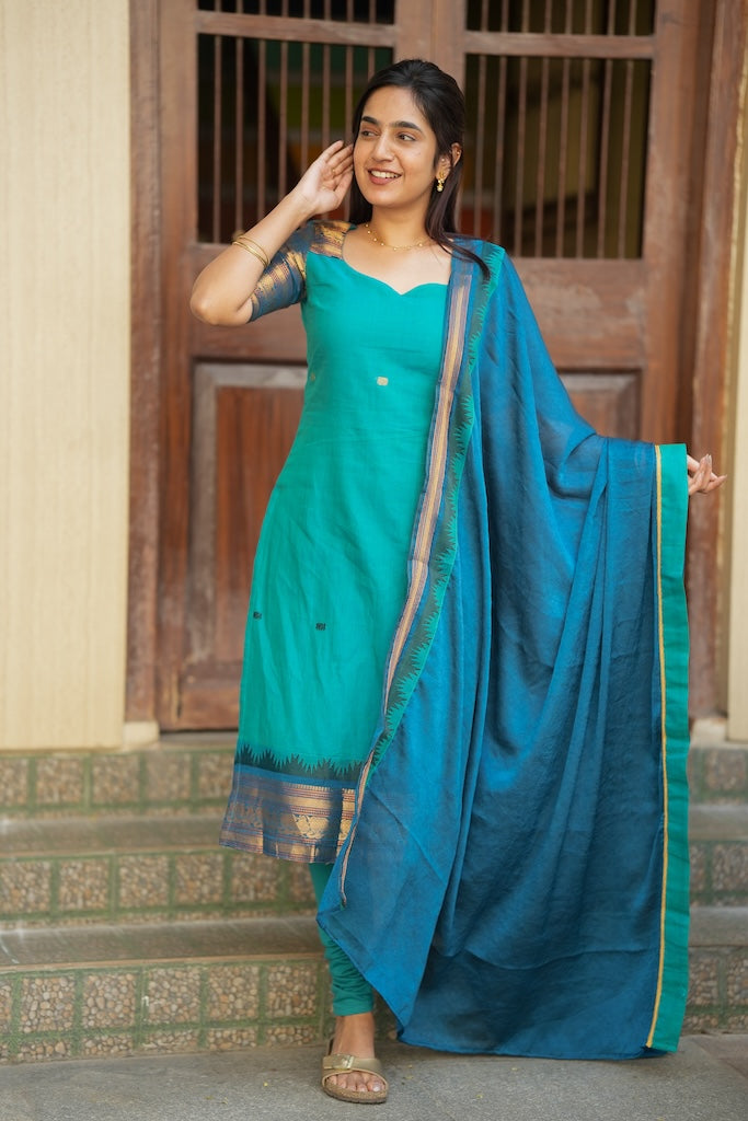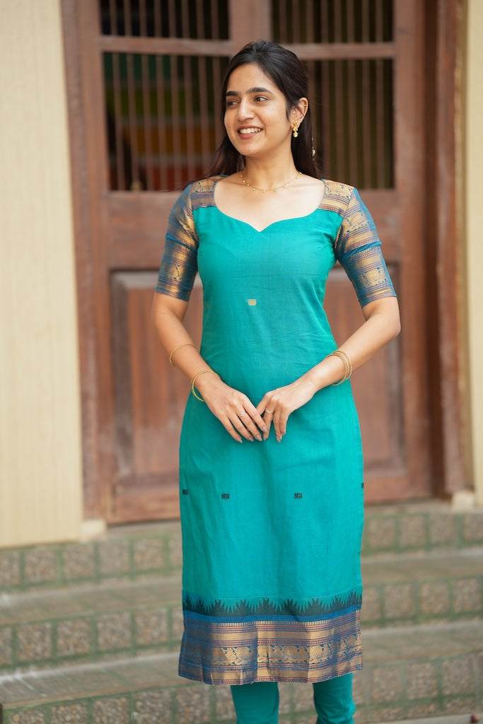 The Madhuri Blue Kurti Set is a temple-appropriate handloom classic—crafted to feel modest, radiant, and quietly luxurious. Woven in breathable Handloom Chettinad Cotton, this straight-fit kurti is elevated with temple-motif zari borders at the hem and sleeves, paired with a flowing pink-bordered dupatta that adds the perfect festive contrast.