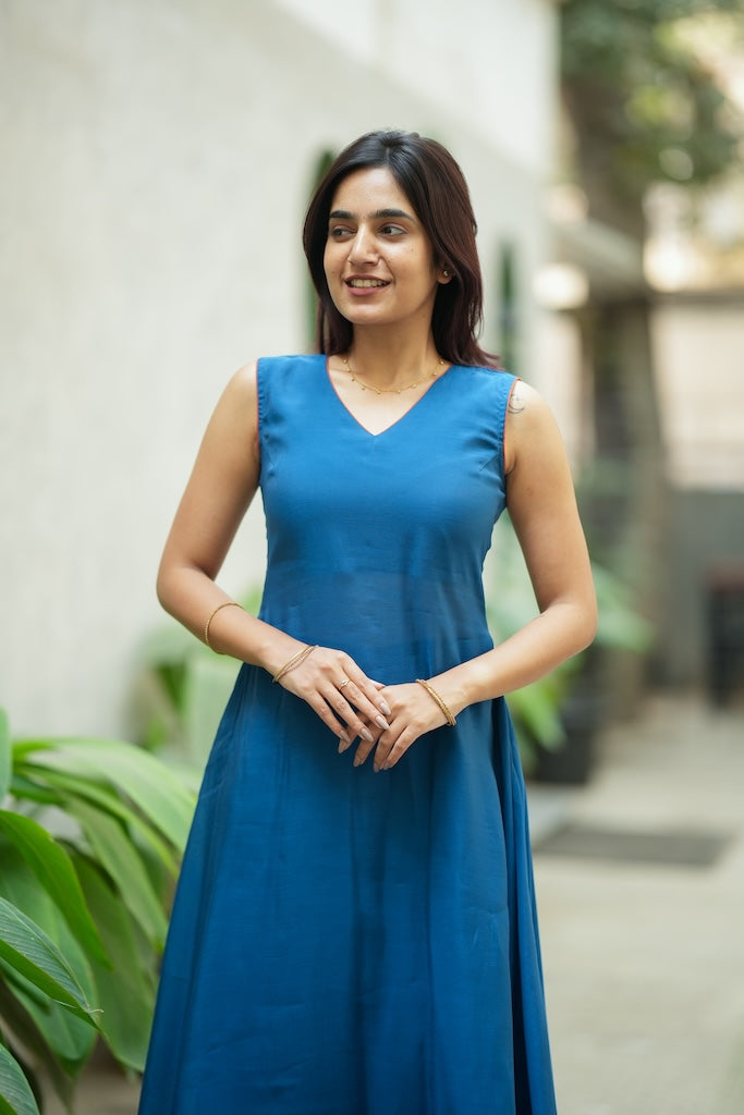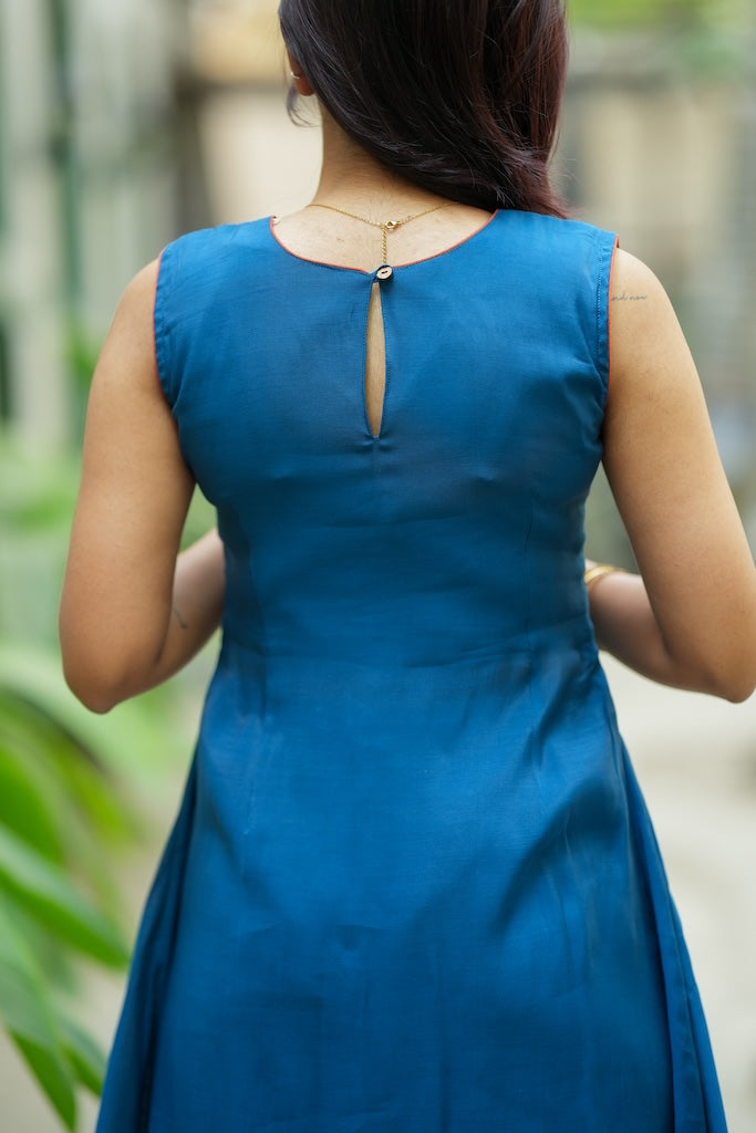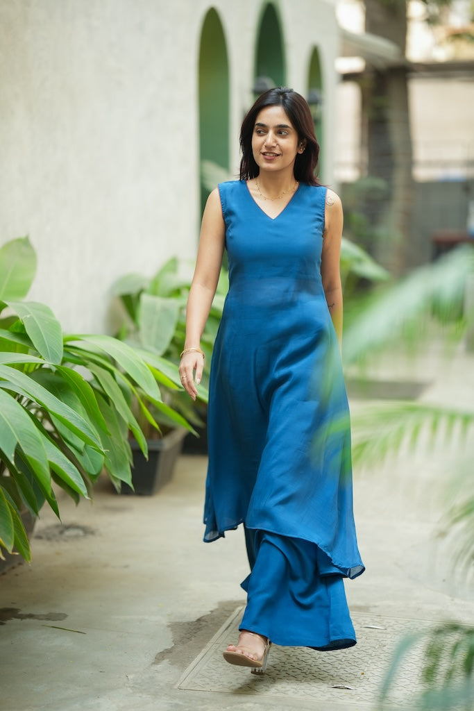 When you want the ease of everyday Indian wear, but the drama of a contemporary gown, the Nandhitha Teal Kurta Set is the perfect in-between. Crafted in breathable mul cotton, this solid teal set features a high-low layered kurti with a soft, elegant flare that floats as you move. Paired with matching bellbottom pants, it creates a clean, elongated silhouette that feels light, modern, and effortlessly put-together for warm-weather days, casual outings, and travel-friendly styling.