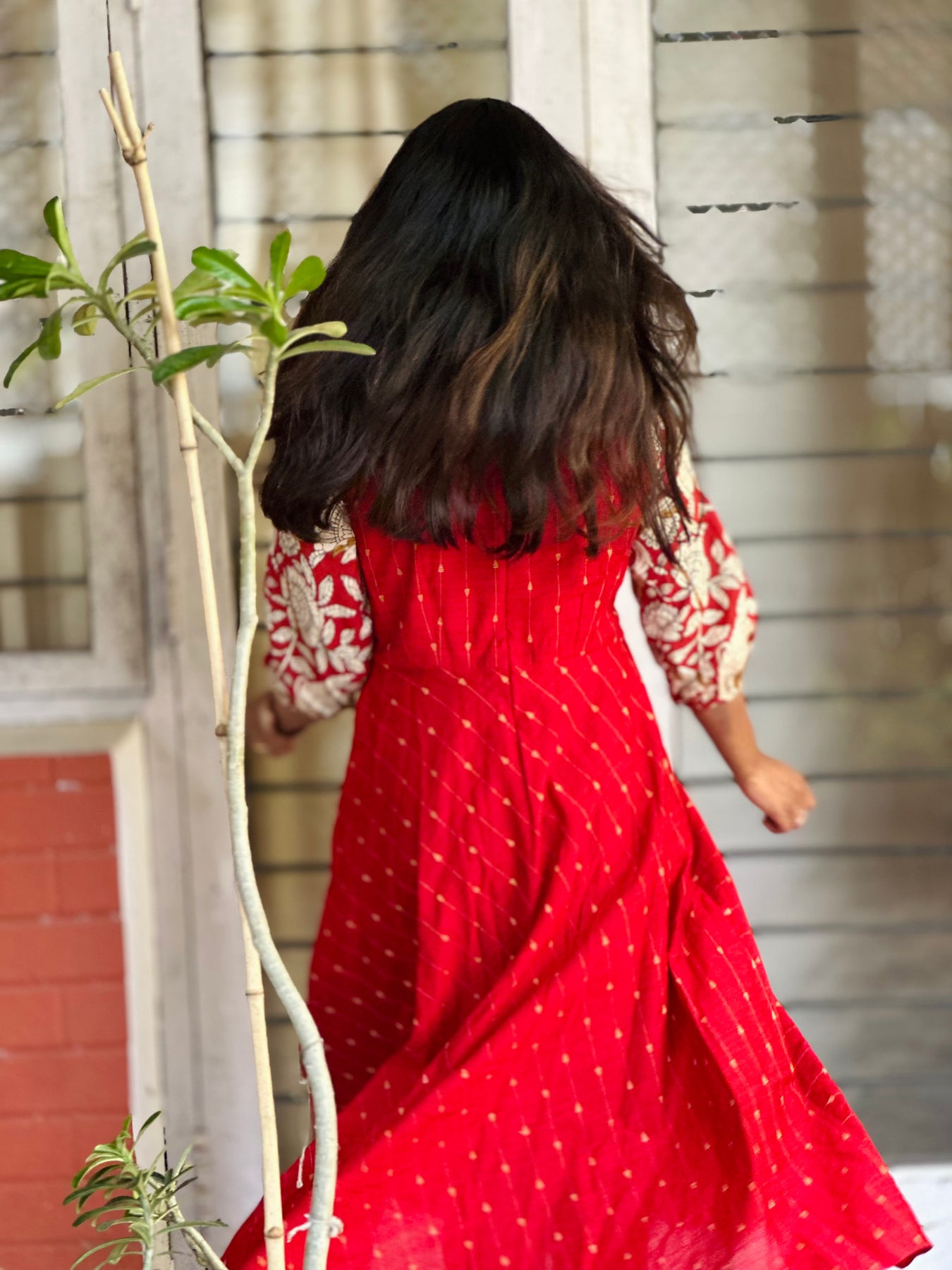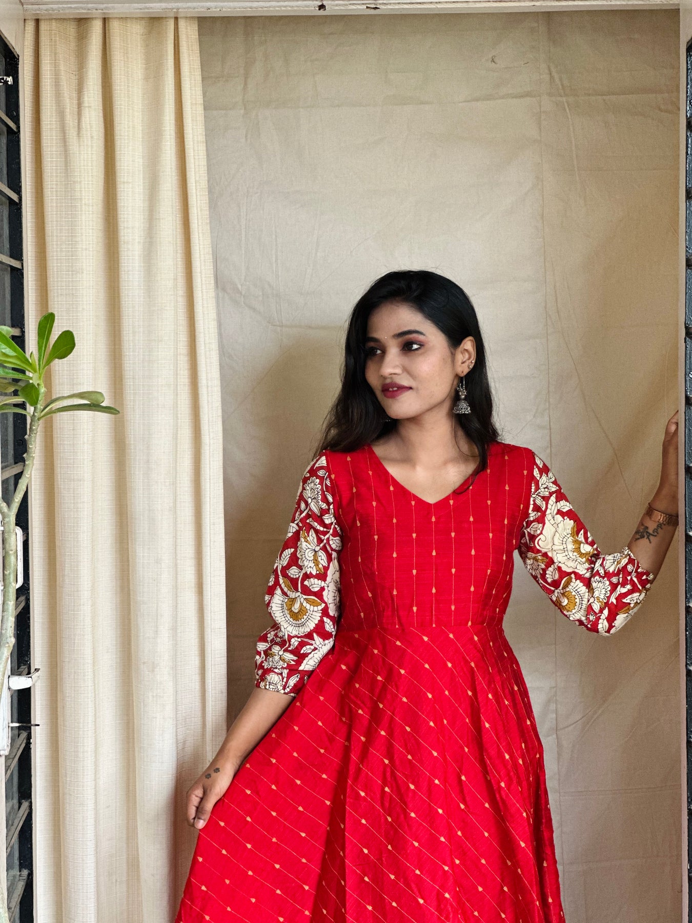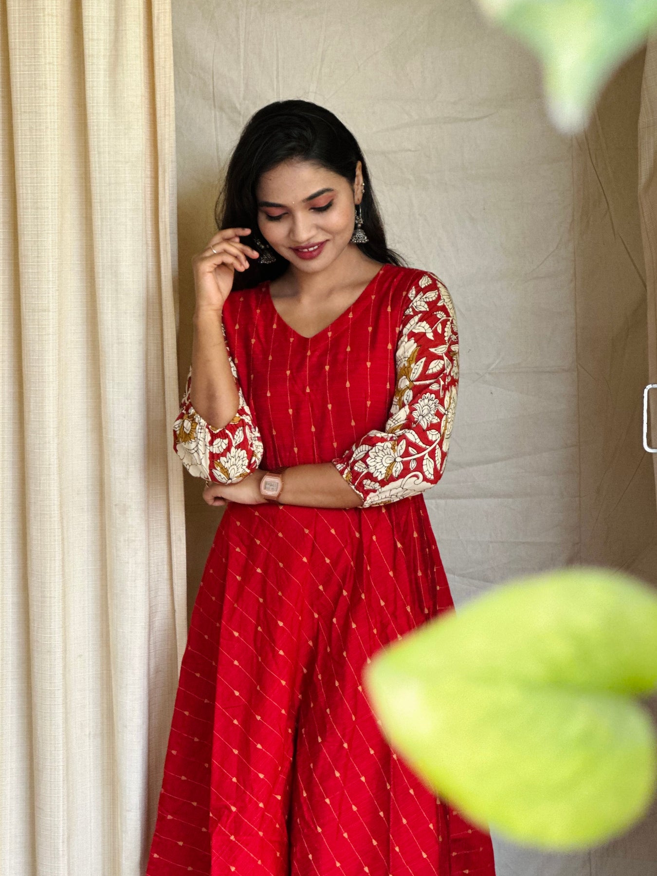 The Bairavi Red Dress combines comfort with style in a flattering shin-length cut. Made from soft dupion silk with beautifully detailed kalamkari sleeves, it works for festivals, celebrations, or everyday elegance. A versatile piece that transitions effortlessly from day to evening.
