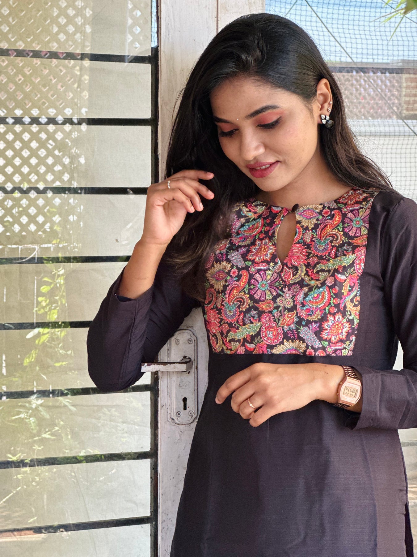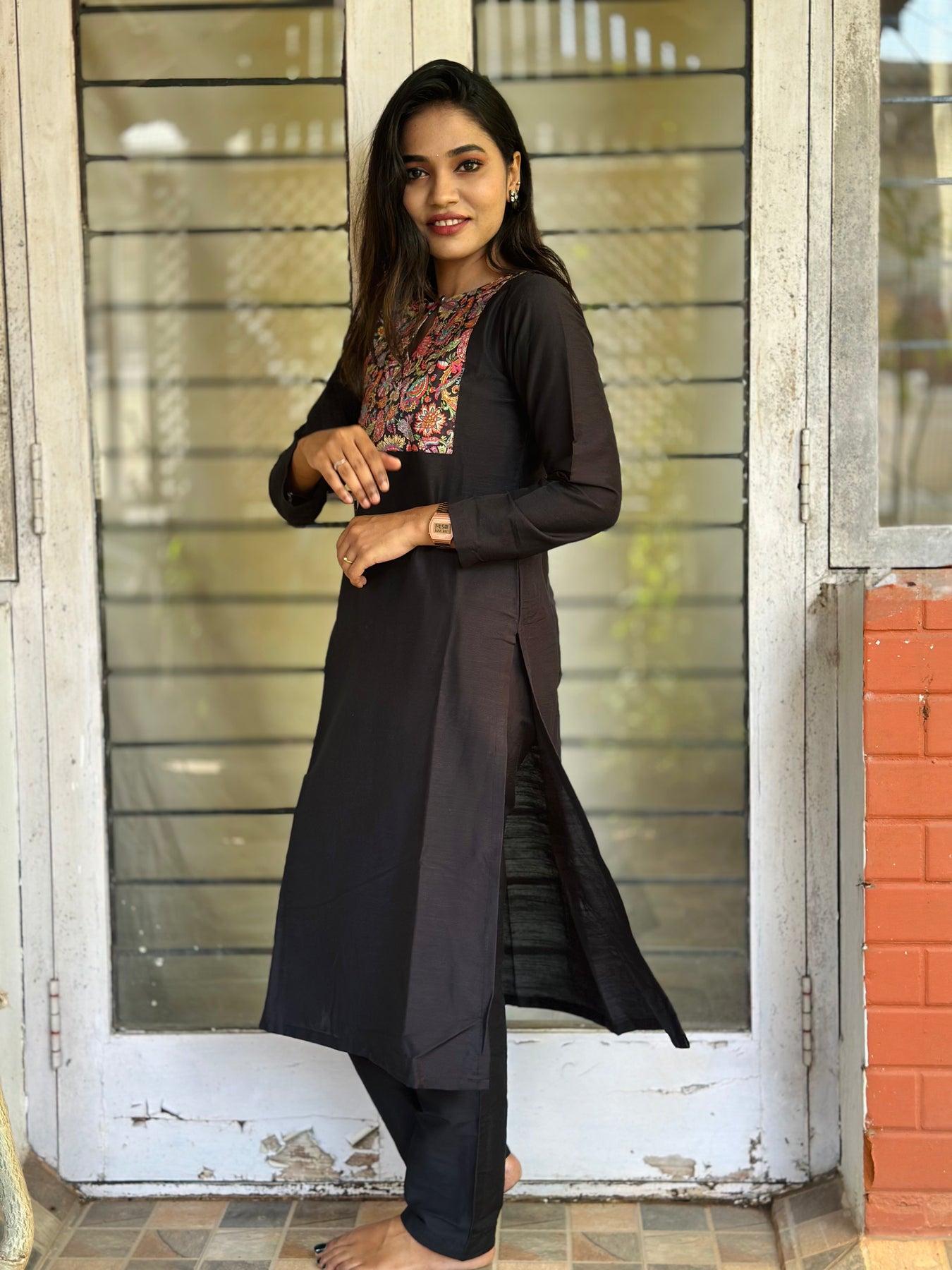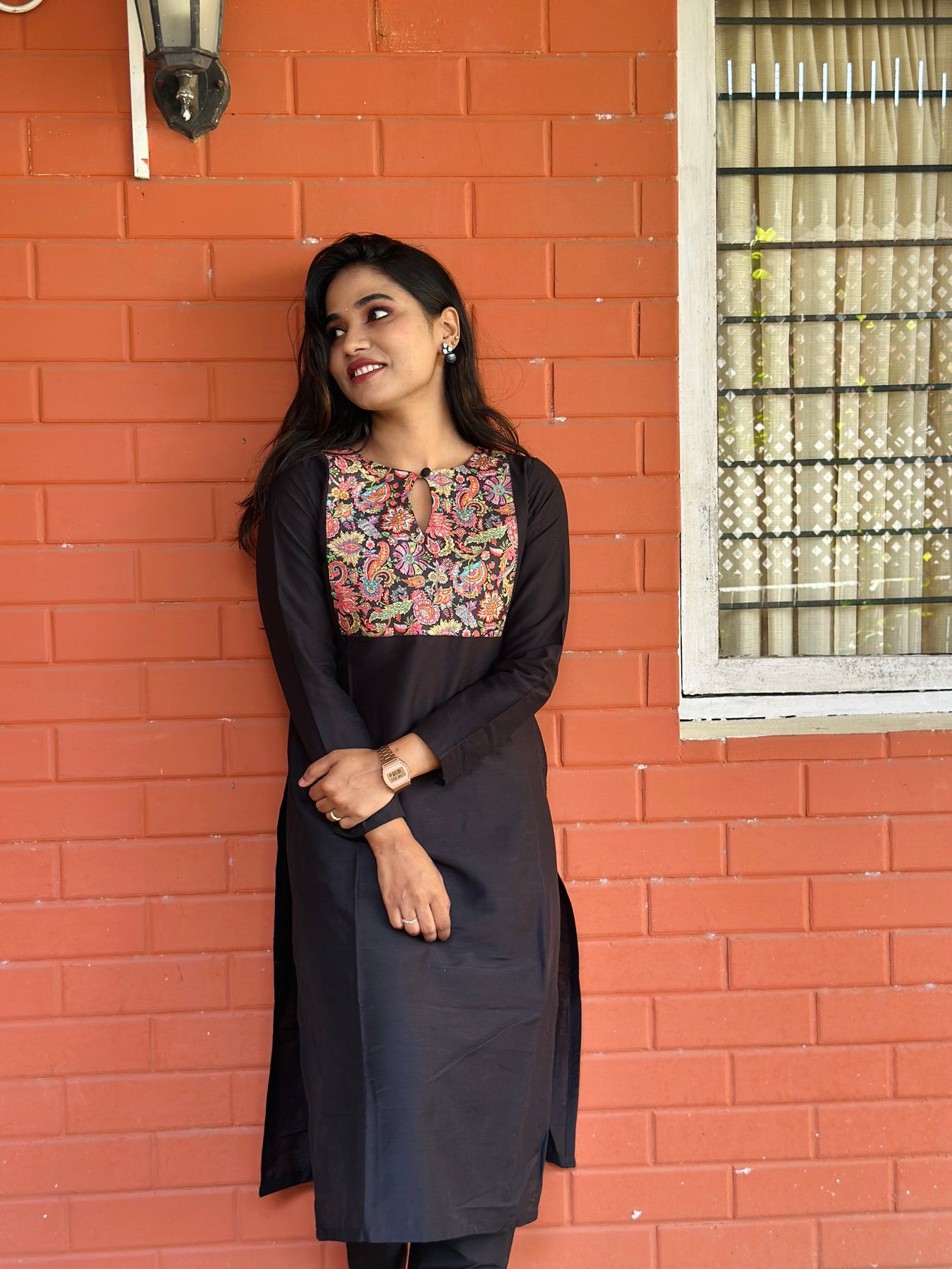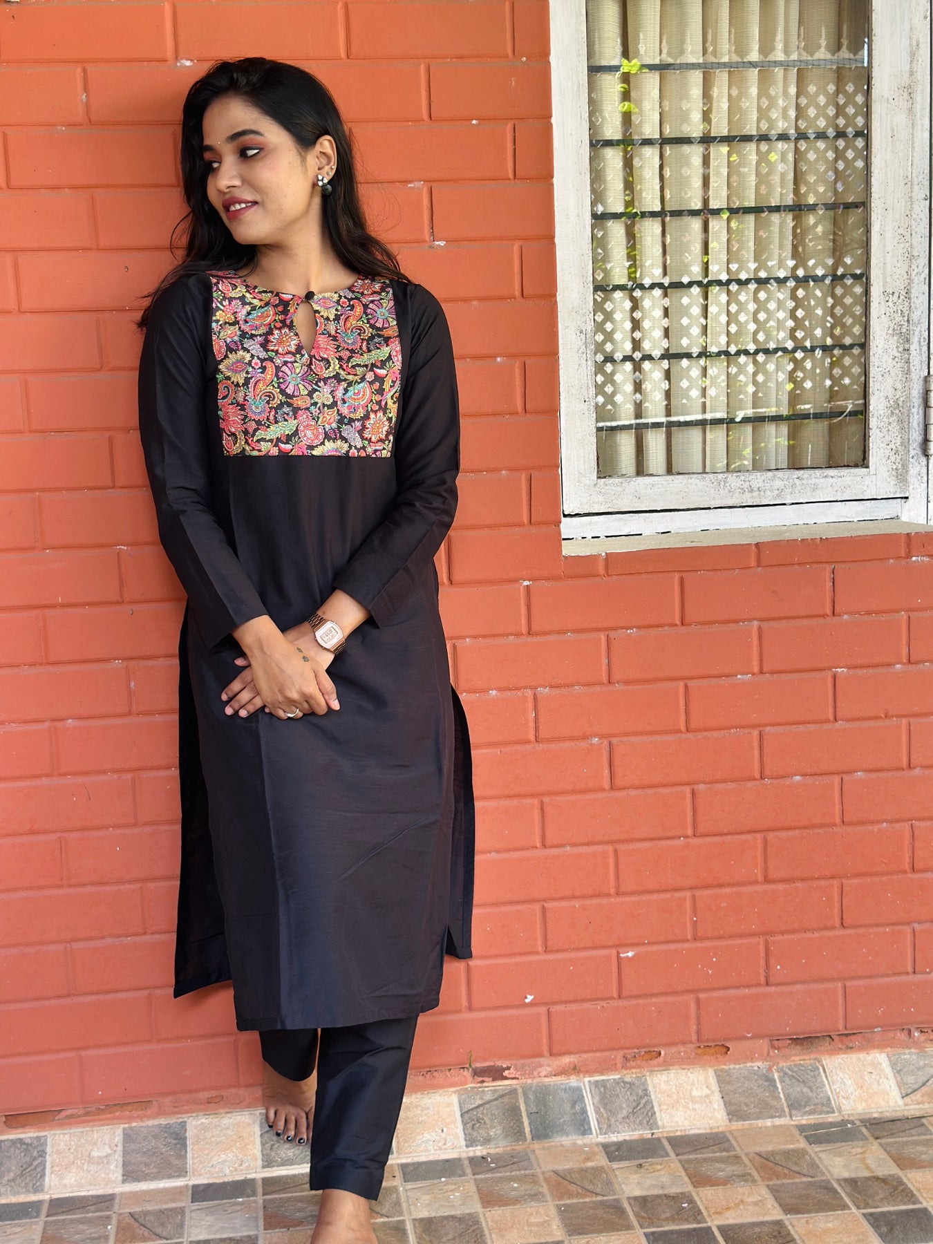 Maaya Black Suit Set redefines what a statement piece can be. This two-piece ensemble pairs dupion silk with tussar patchwork in a way that feels completely natural. No fuss, no complexity—just thoughtful design that lets you stand out without trying.