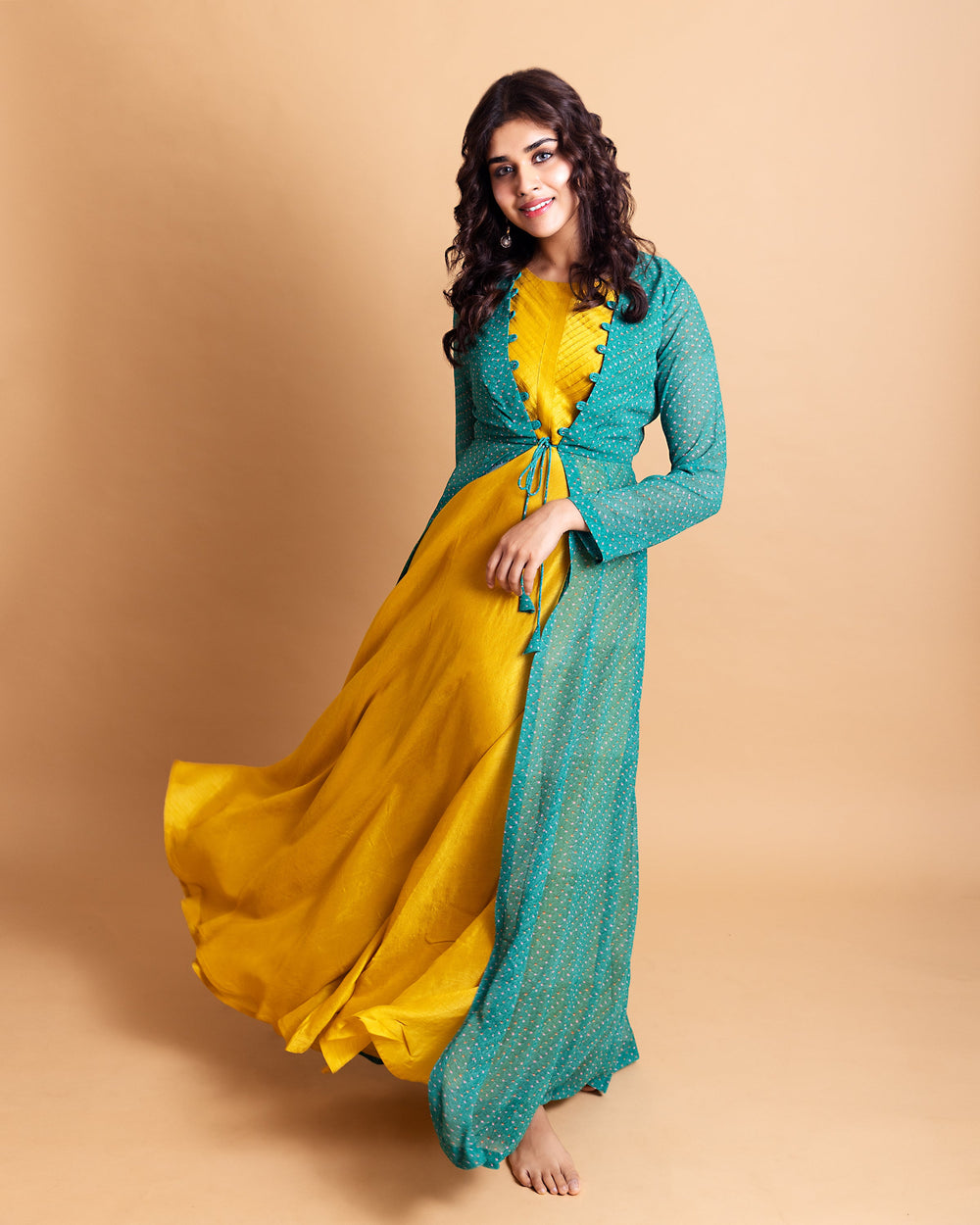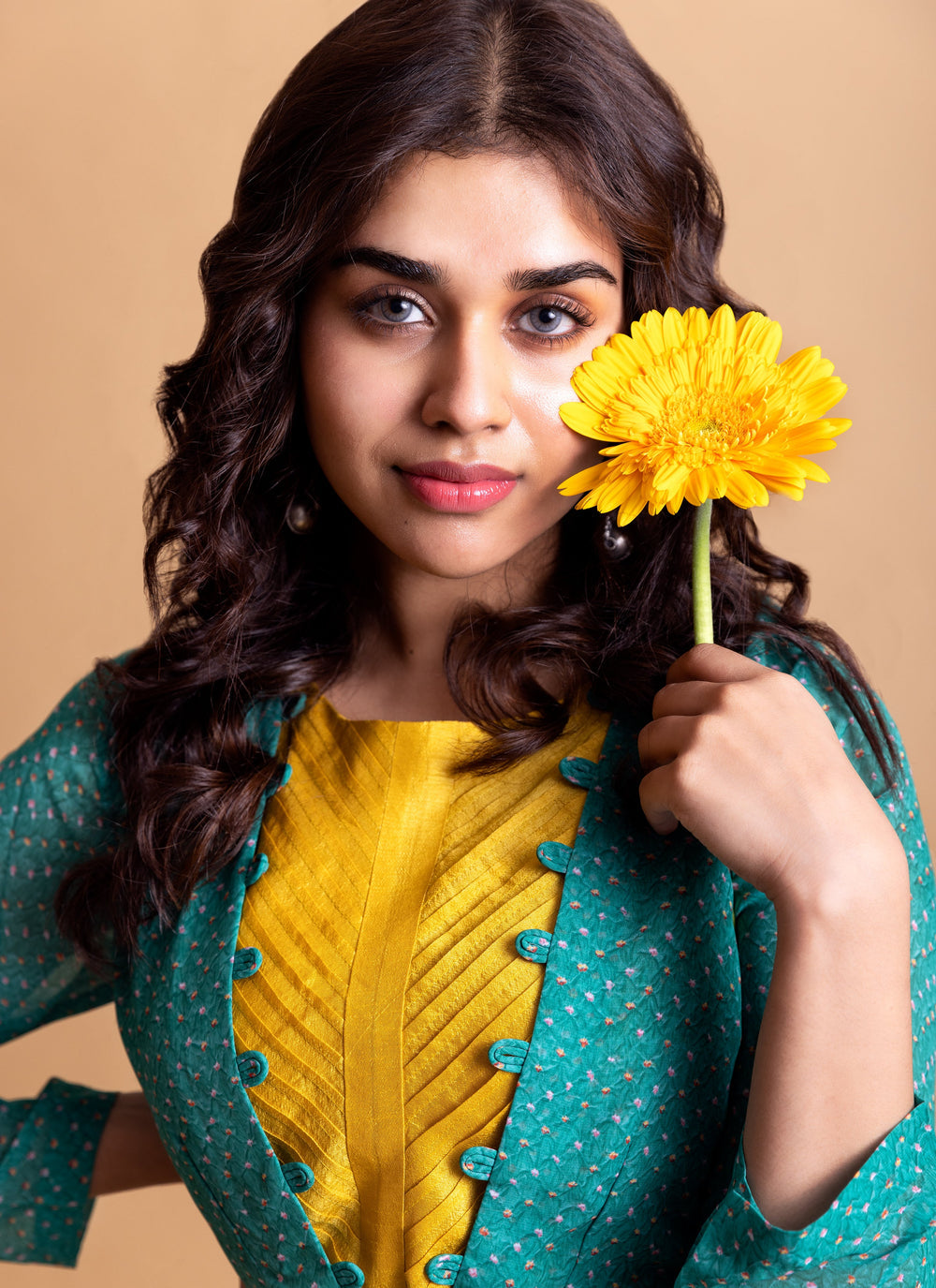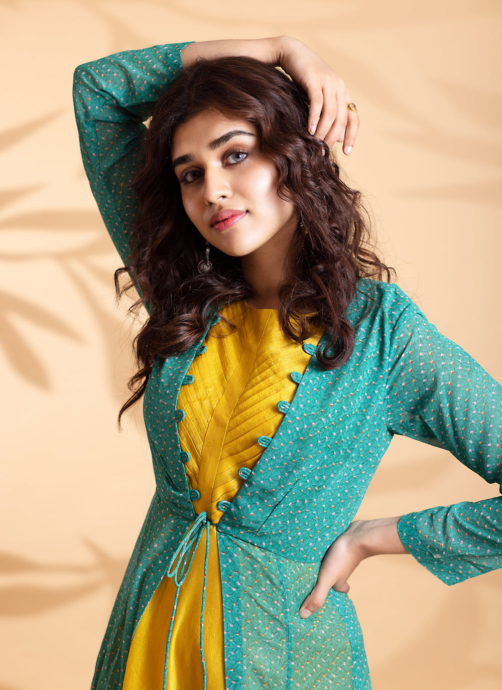 Textured cotton dress with pintucks in a definite pattern along with screen print and loop details on the Jacket. A perfect bright occasion wear.