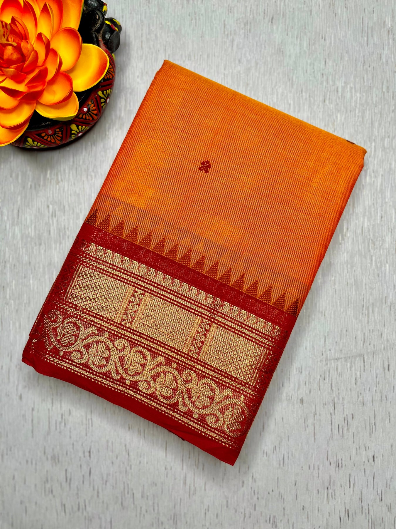 Chettinad Cotton Saree - Pumpkin Orange + Bright Red