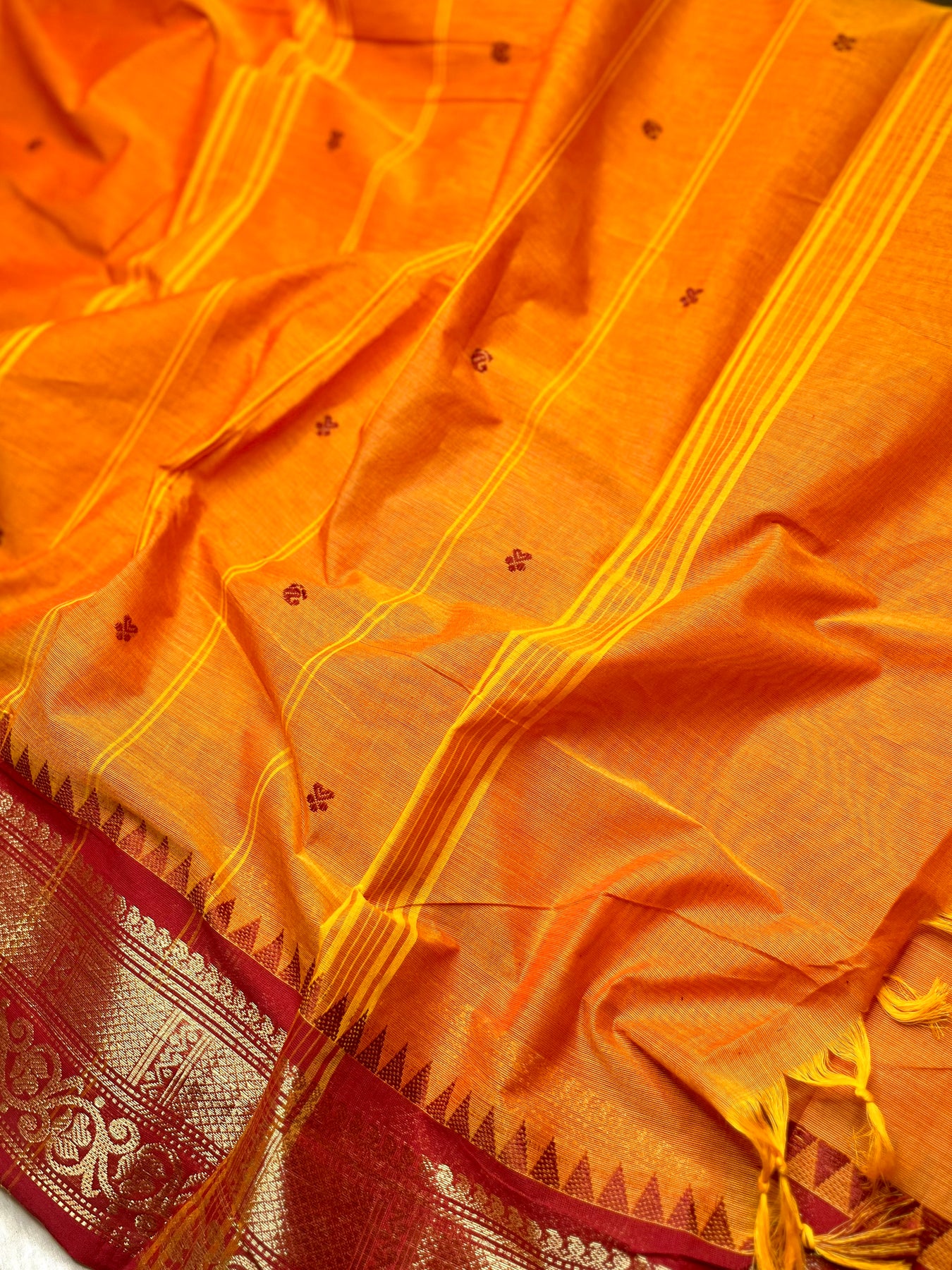 Check out the beautiful shade of  pumpkin orange and bright red chettinad cotton saree with buttas all over the body and striped pallu. This saree comes with a running blouse.