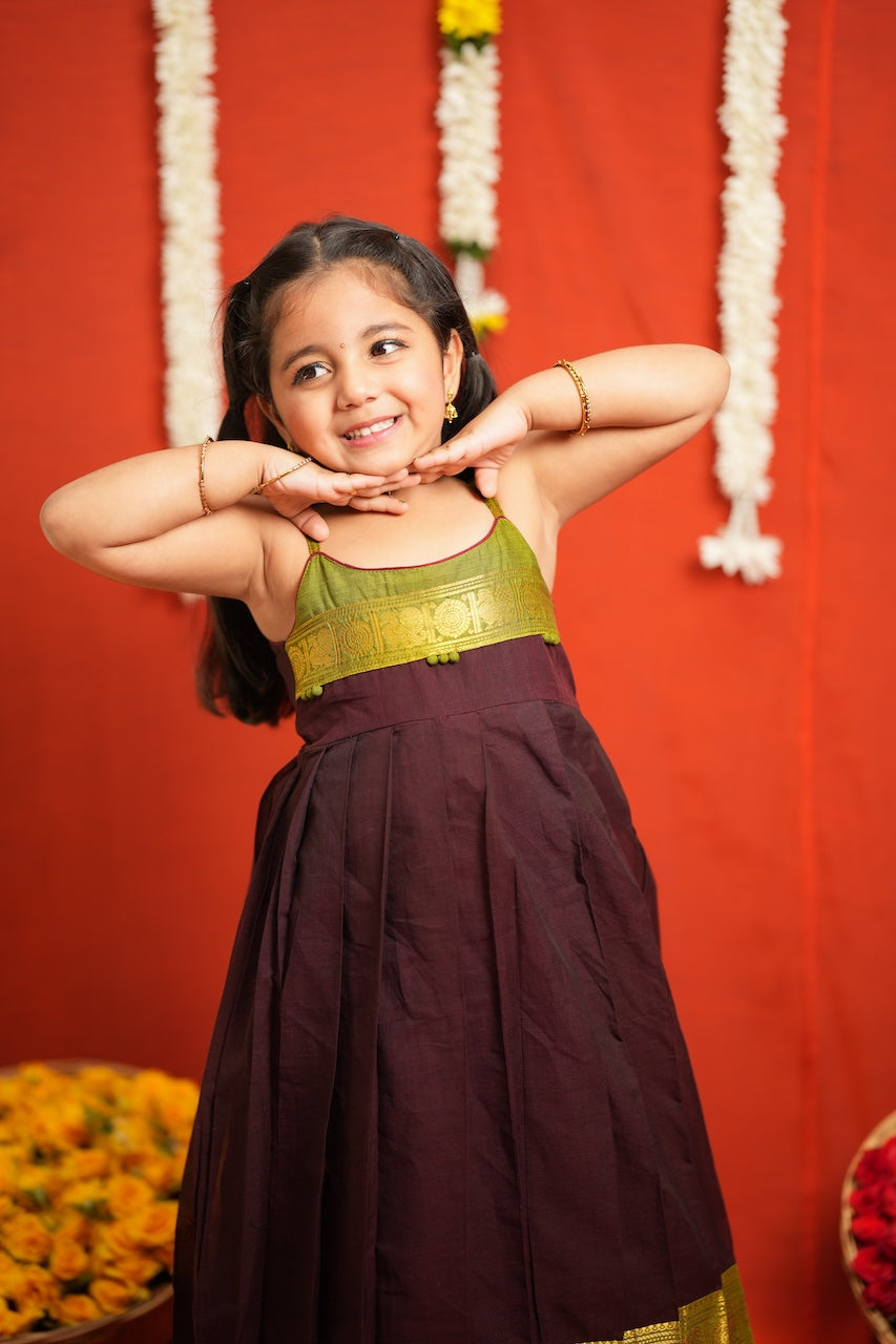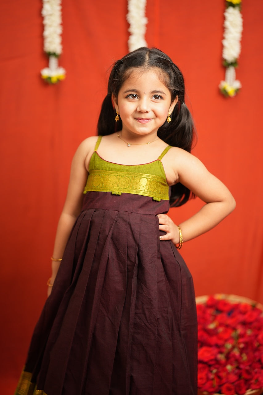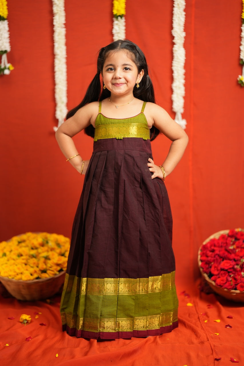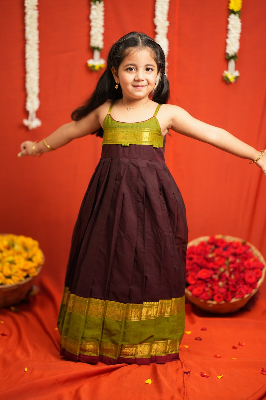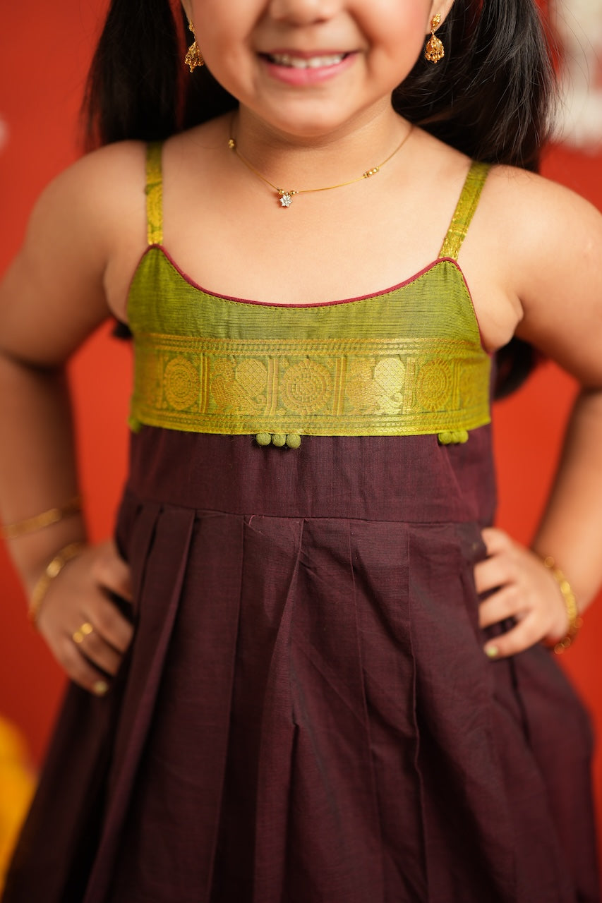 The Ira Brown Frock Mini is a celebration of South Indian heritage—woven in breathable handwoven Chettinad cotton and finished with a rich olive green zari border inspired by temple weaves. Designed for little girls who glow brightest during poojas, temple visits, and festive rituals, this frock blends cultural authenticity with all-day comfort. The deep chocolate brown body paired with the traditional woven hem gives it a timeless, heirloom-worthy charm. Lightweight, graceful, and sacred in spirit—this is ethnic wear crafted for meaningful moments.