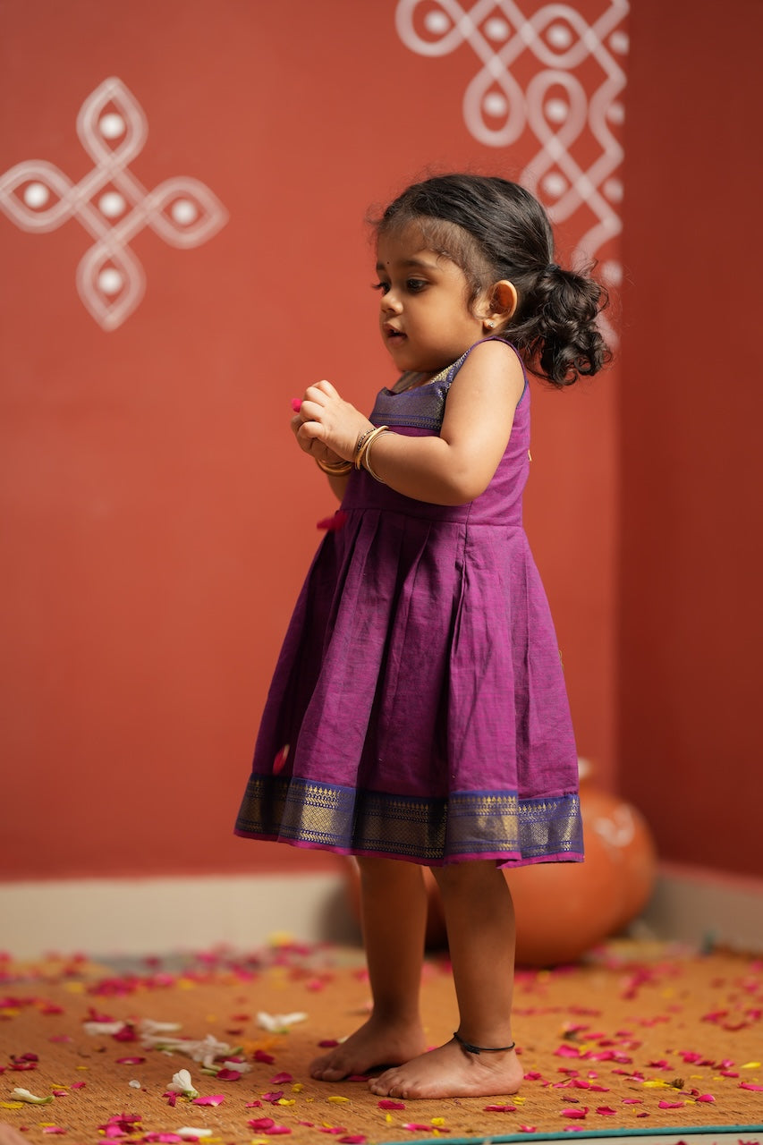 The Magadhi Violet Frock Mini is designed for serene summer days, temple visits, and soulful celebrations. Crafted from pure Mangalgiri cotton, this frock reflects simplicity, tradition, and comfort in equal measure.