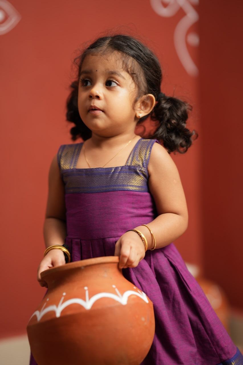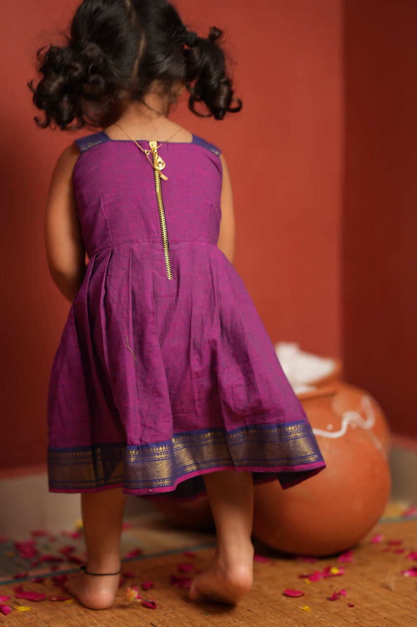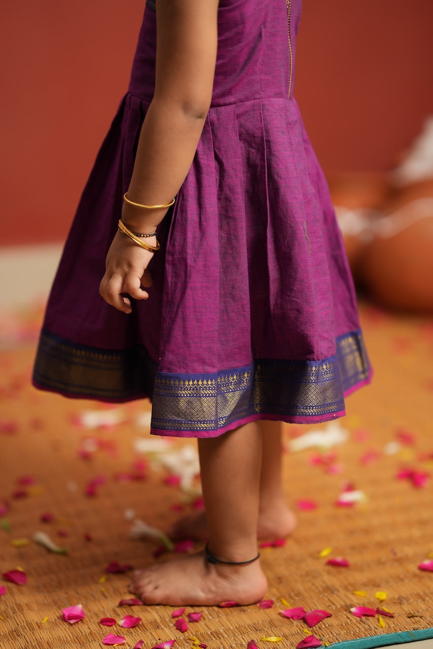 The rich purple body is beautifully finished with a temple-inspired zari border in blue tones, lending it a graceful South Indian aesthetic. Lightweight, breathable, and free from lining, this frock keeps little ones cool and comfortable—perfect for long hours of wear during poojas and cultural occasions.