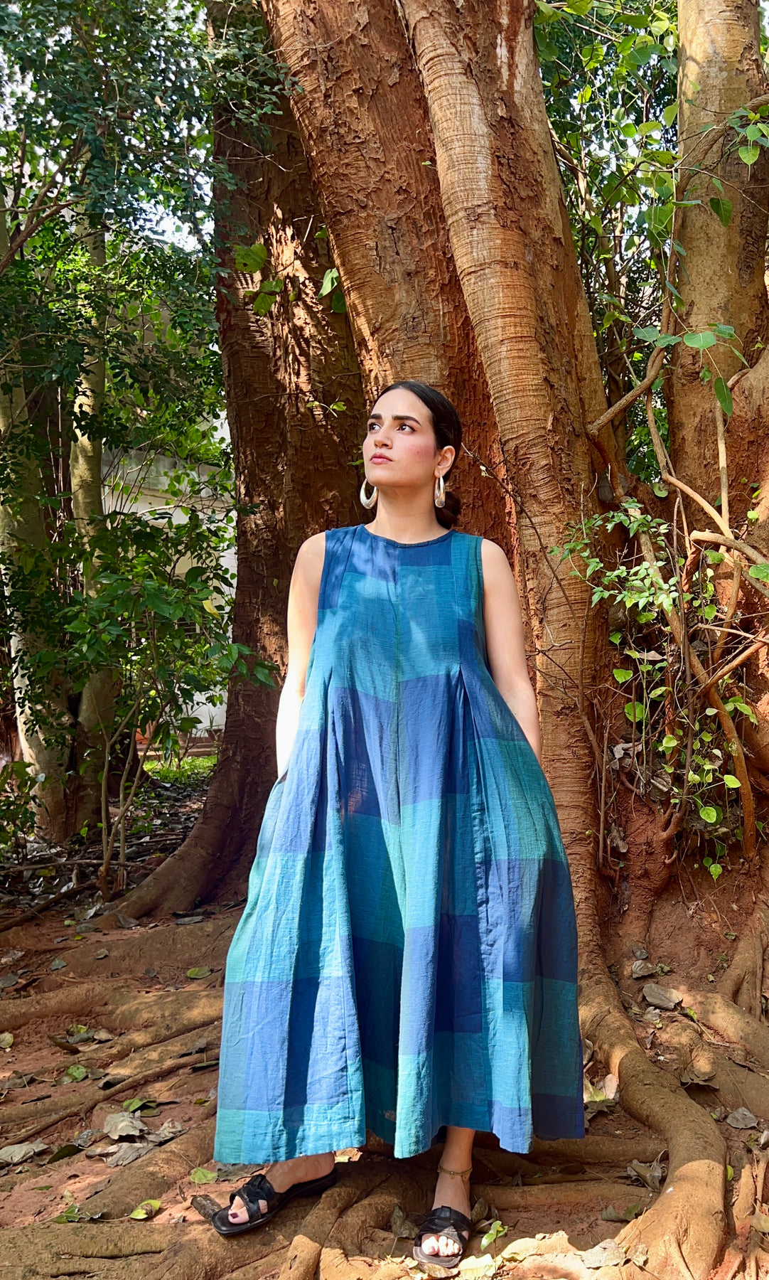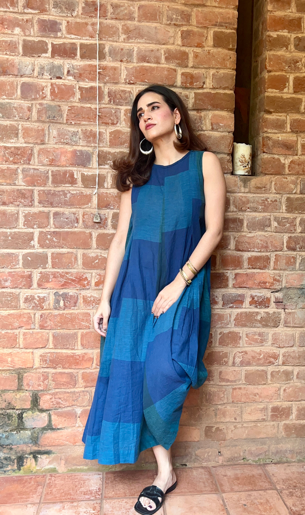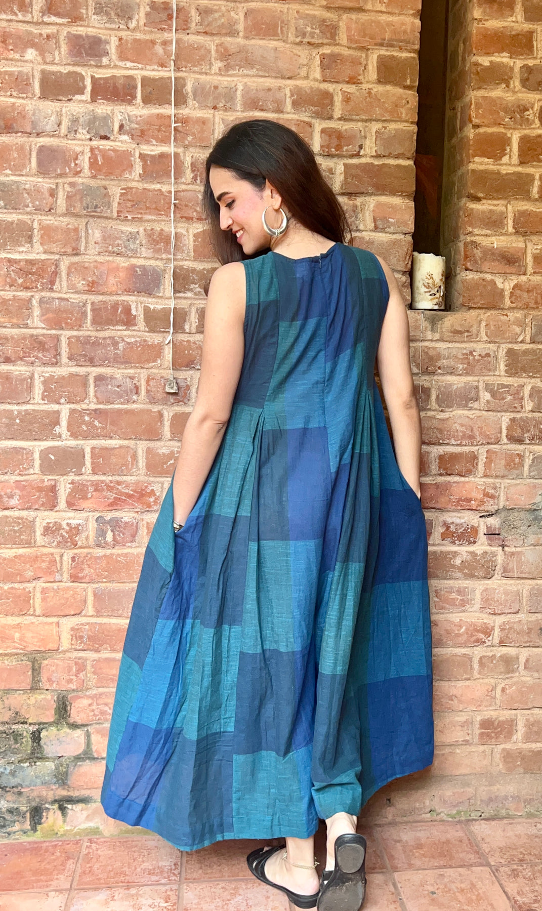 Our loose fitting handloom cotton jumpsuit with a high round neck has a zip at the back and pockets on both sides. It is sleeveless in deep forest green and Prussian blue.