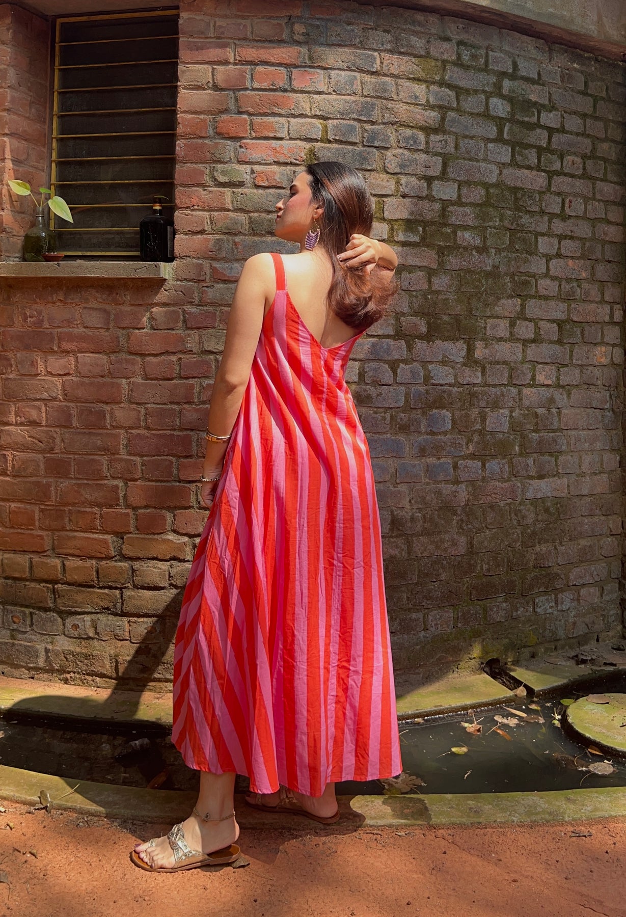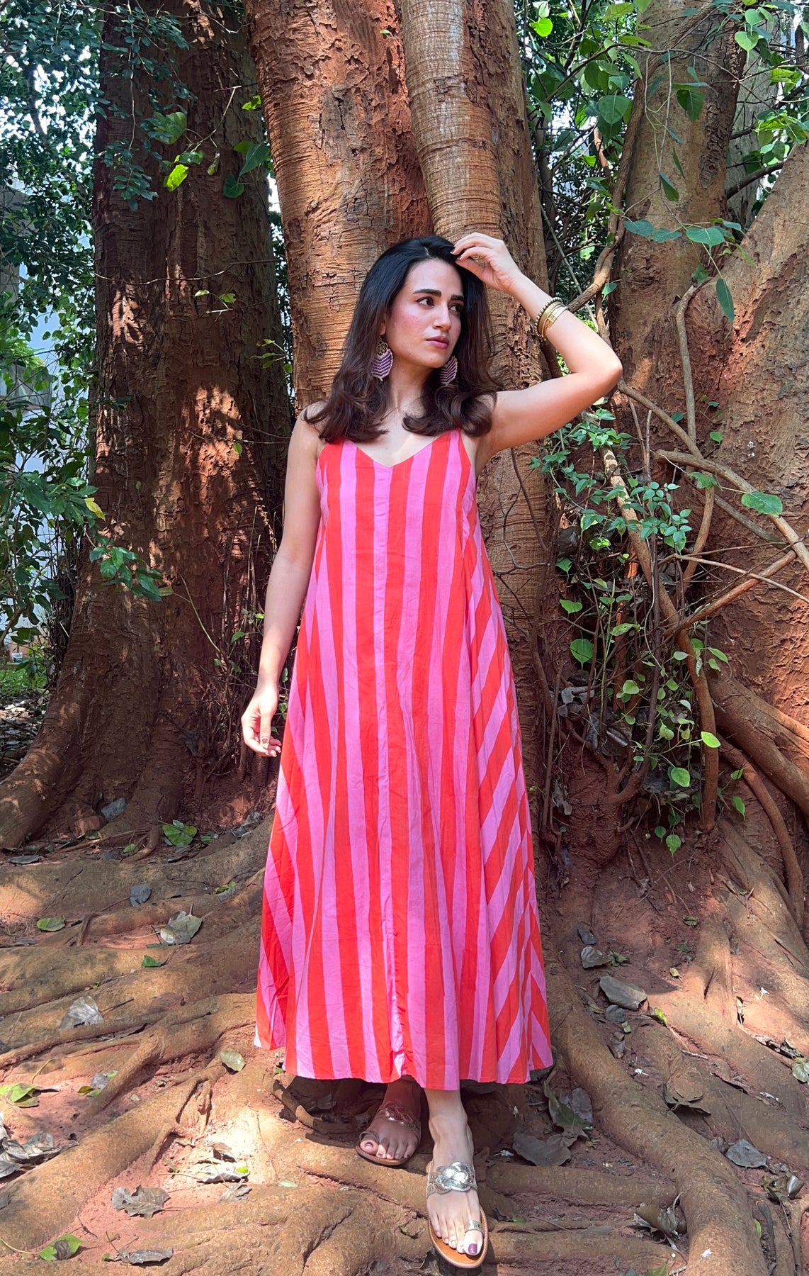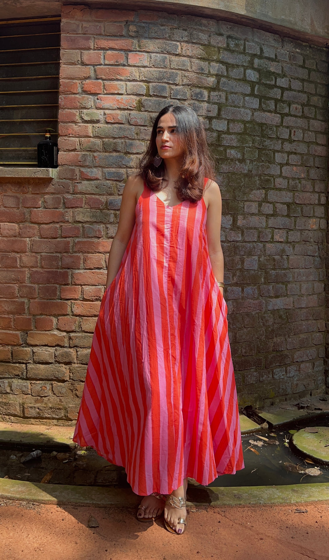 Our maxi dress is ankle length, with pockets on both sides and has mul cotton lining. It has an A line cut, slim straps and hand-block printed bright orange and pink stripes. With a deep V neckline and back.