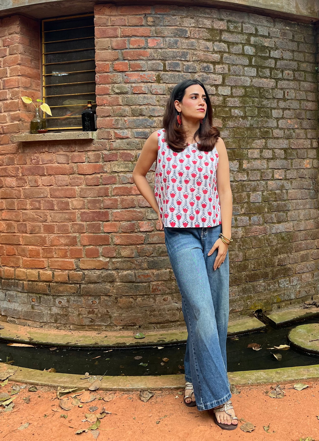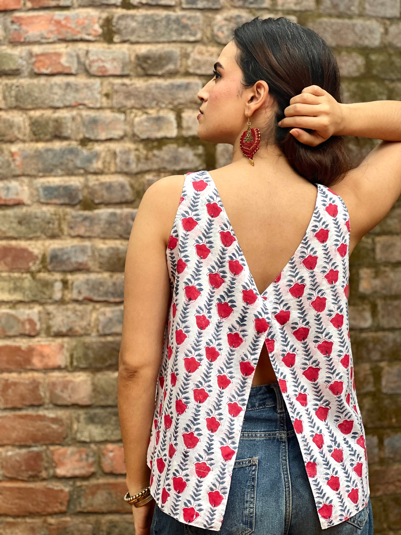 Our open back top is made out of handloom cotton and is loose fitted. It is hand block printed with a U neckline and V back.