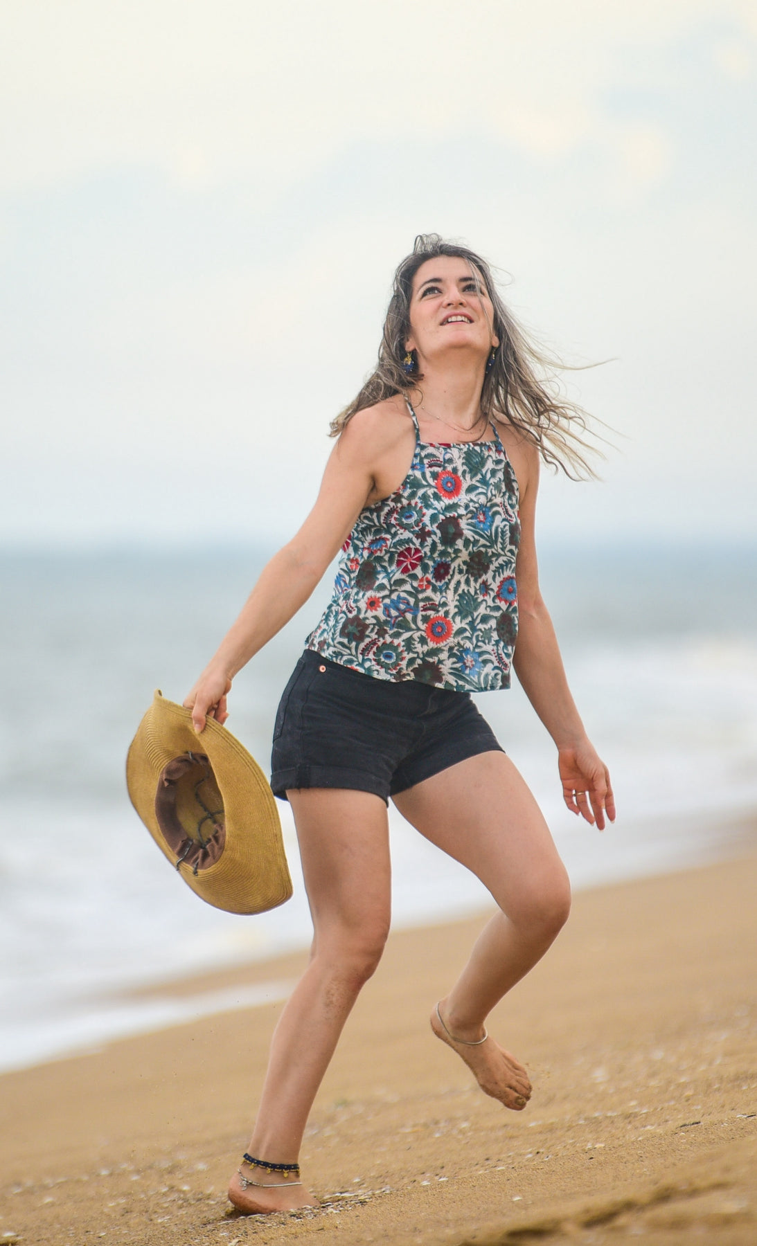 Hand-block Printed Box-fit cotton top with broad shoulder straps and an open back with adjustable tie-up detail at the back