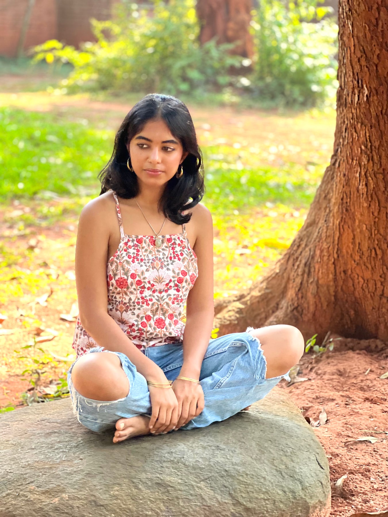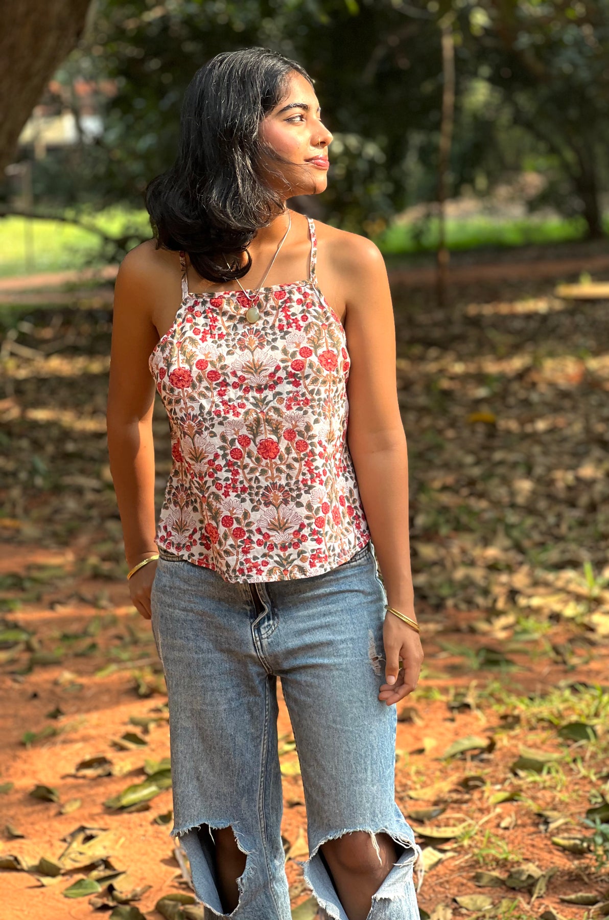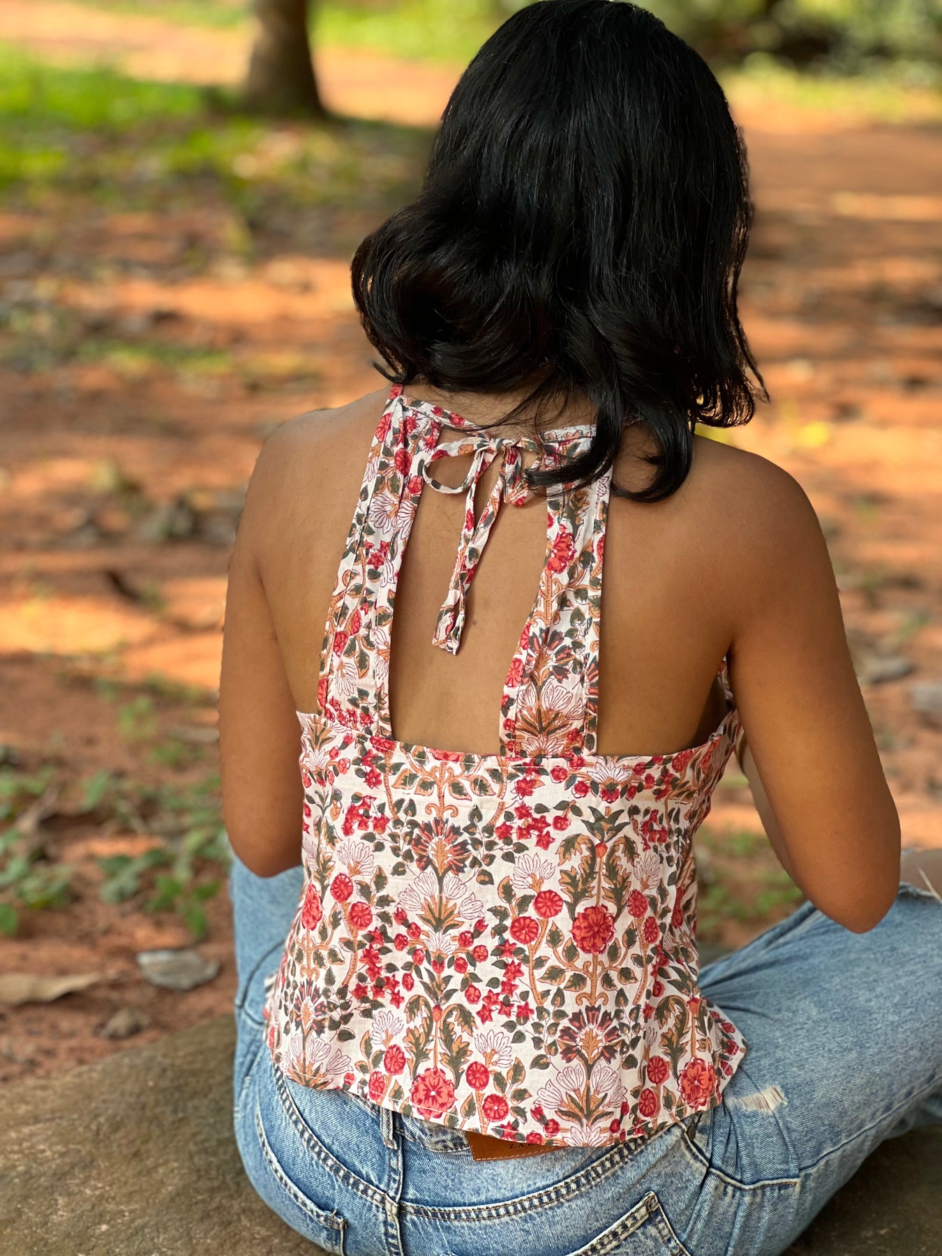 Hand-block Printed Box-fit cotton top with broad shoulder straps and an open back with adjustable tie-up detail at the back