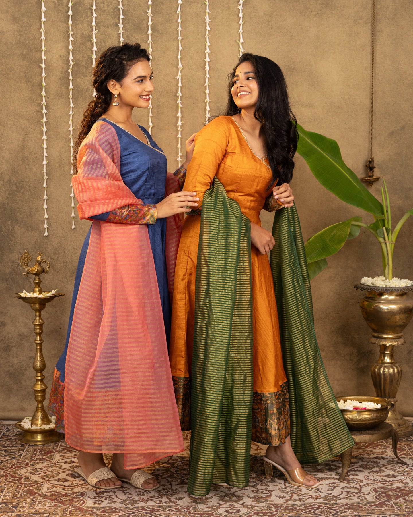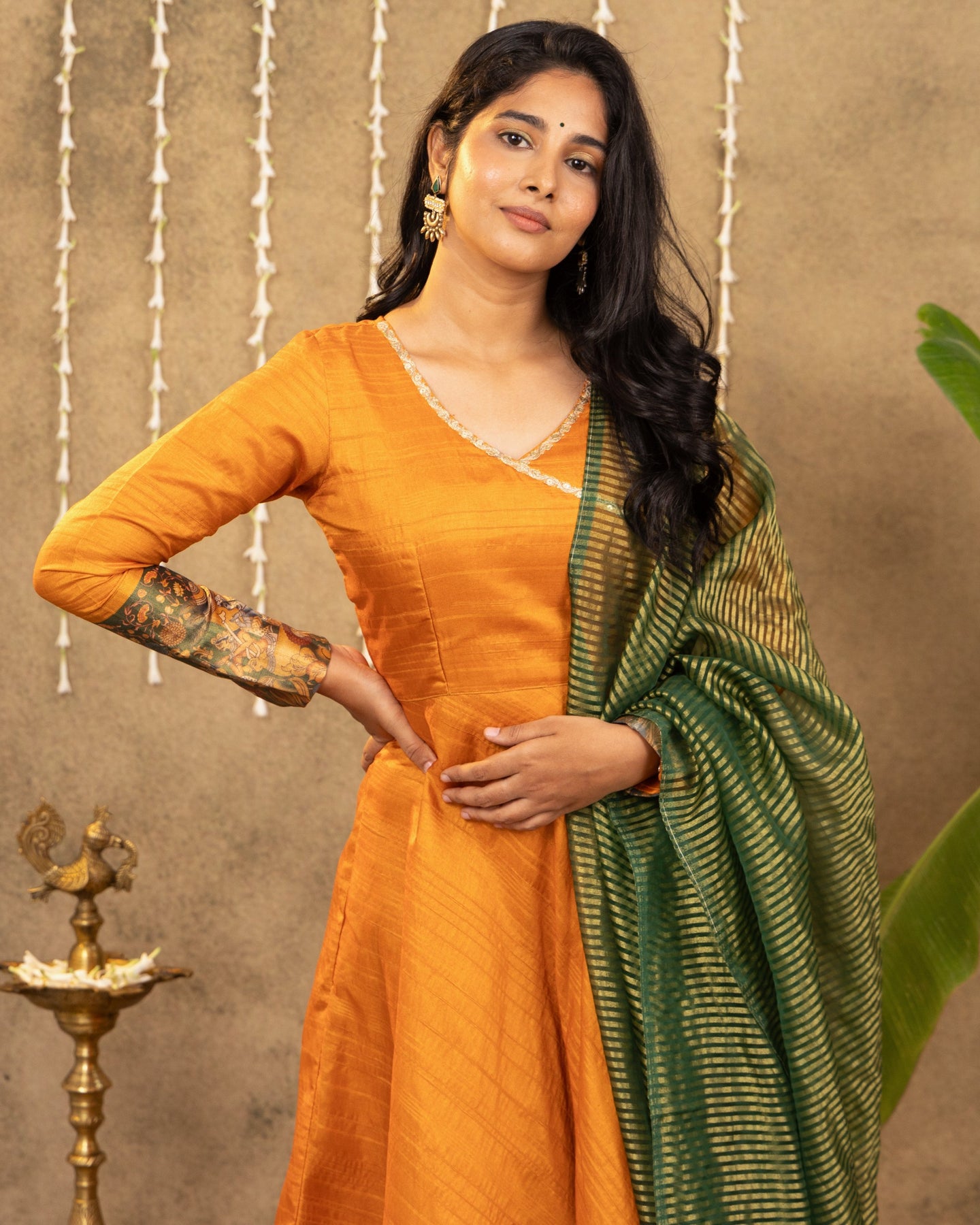 Raw silk anarkali in marigold yellow with an intricately detailed Pichwai border and sequins embroidered along the neckline. Paired with a striped green organza dupatta, this beautiful ensemble is perfect for festive occasions! Lining provided.
