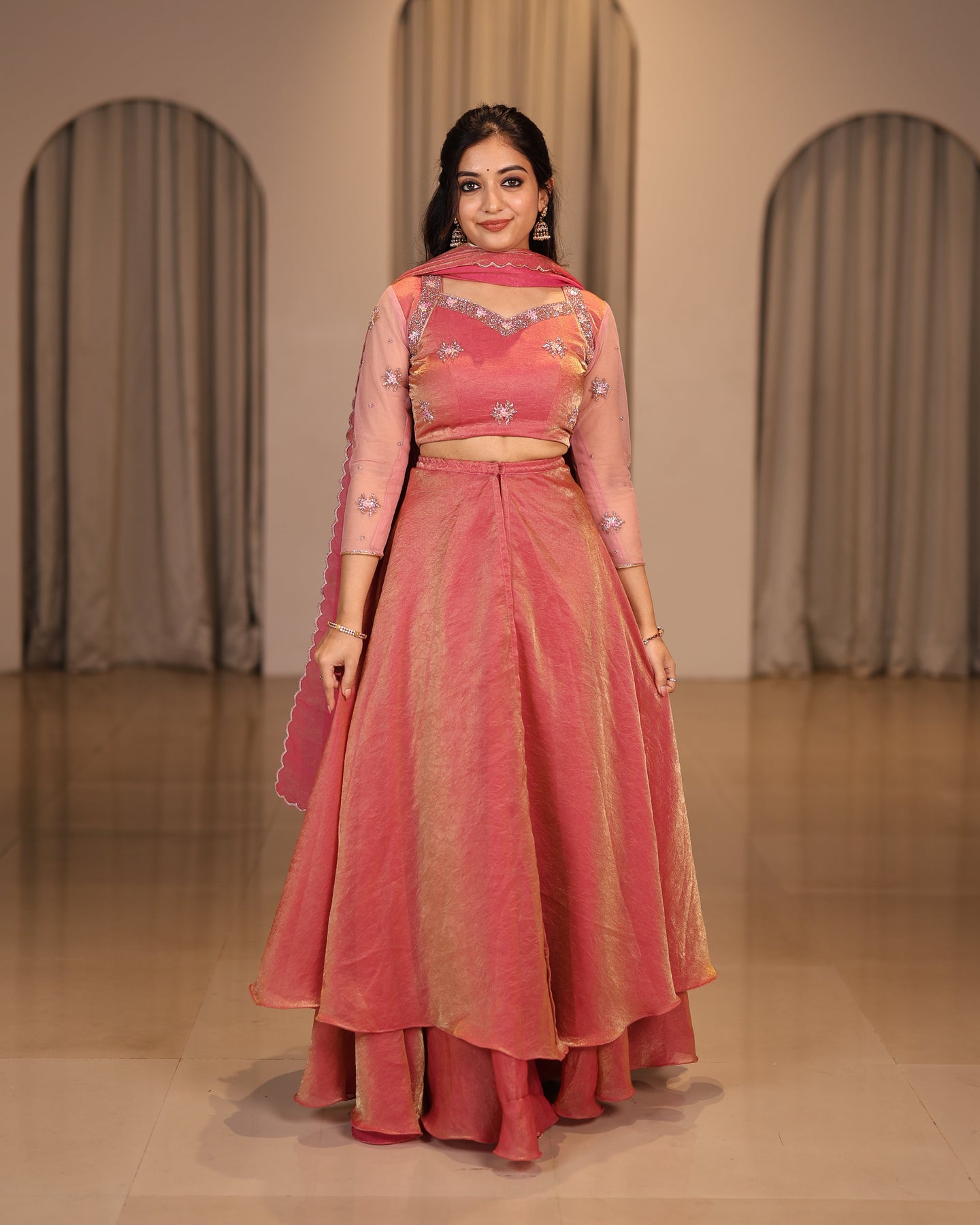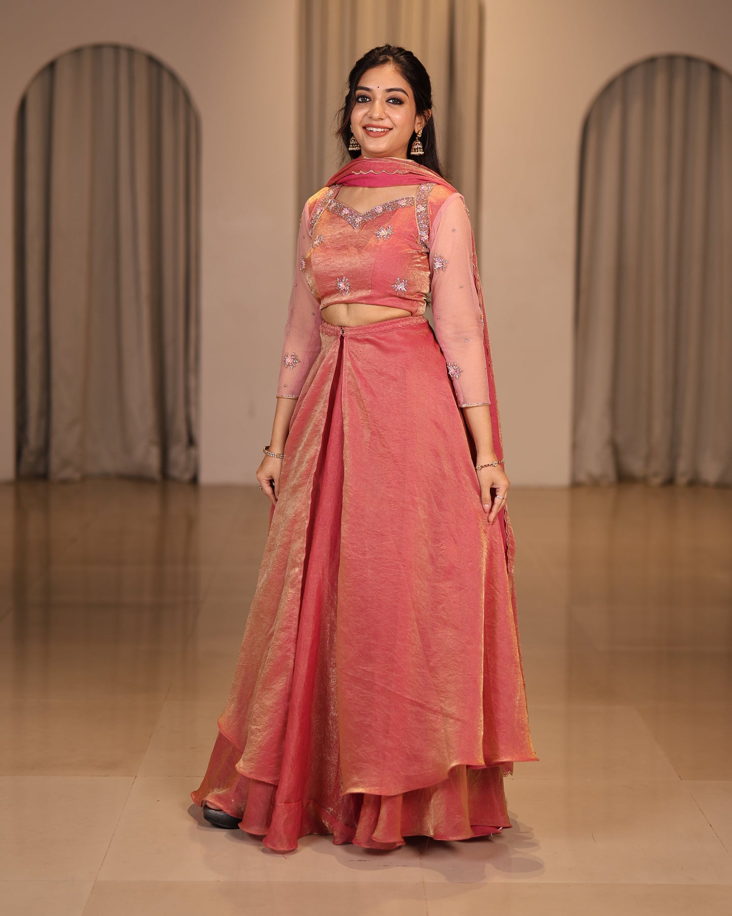 A blend of elegance and versatility, this 3-in-1 crushed space silk ensemble in a soft pink hue redefines festive dressing. The intricate Aari work on the neck and sleeves, paired with delicate net detailing, adds a touch of refined grace and glamour.