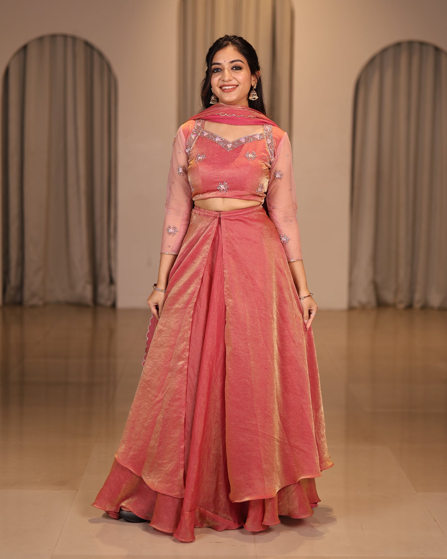 Designed for multiple looks, this set can be styled as a crop top with skirt, a crop top with peplum, or in a graceful drape pattern — perfect for weddings, receptions, and festive occasions.