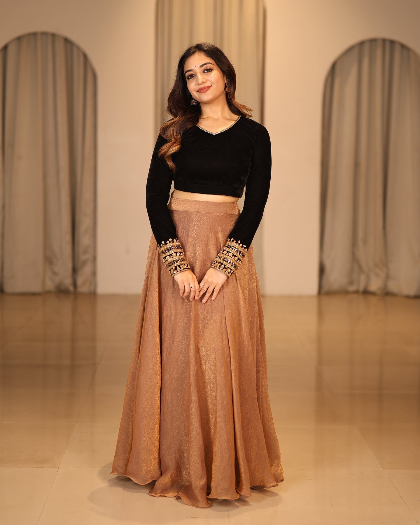 An epitome of luxury and grace, the Anvi ensemble blends rich black velvet with crushed space silk to create a regal statement look. Adorned with intricate neck embellishments and heavy work detailing on the sleeves, it exudes timeless festive allure.