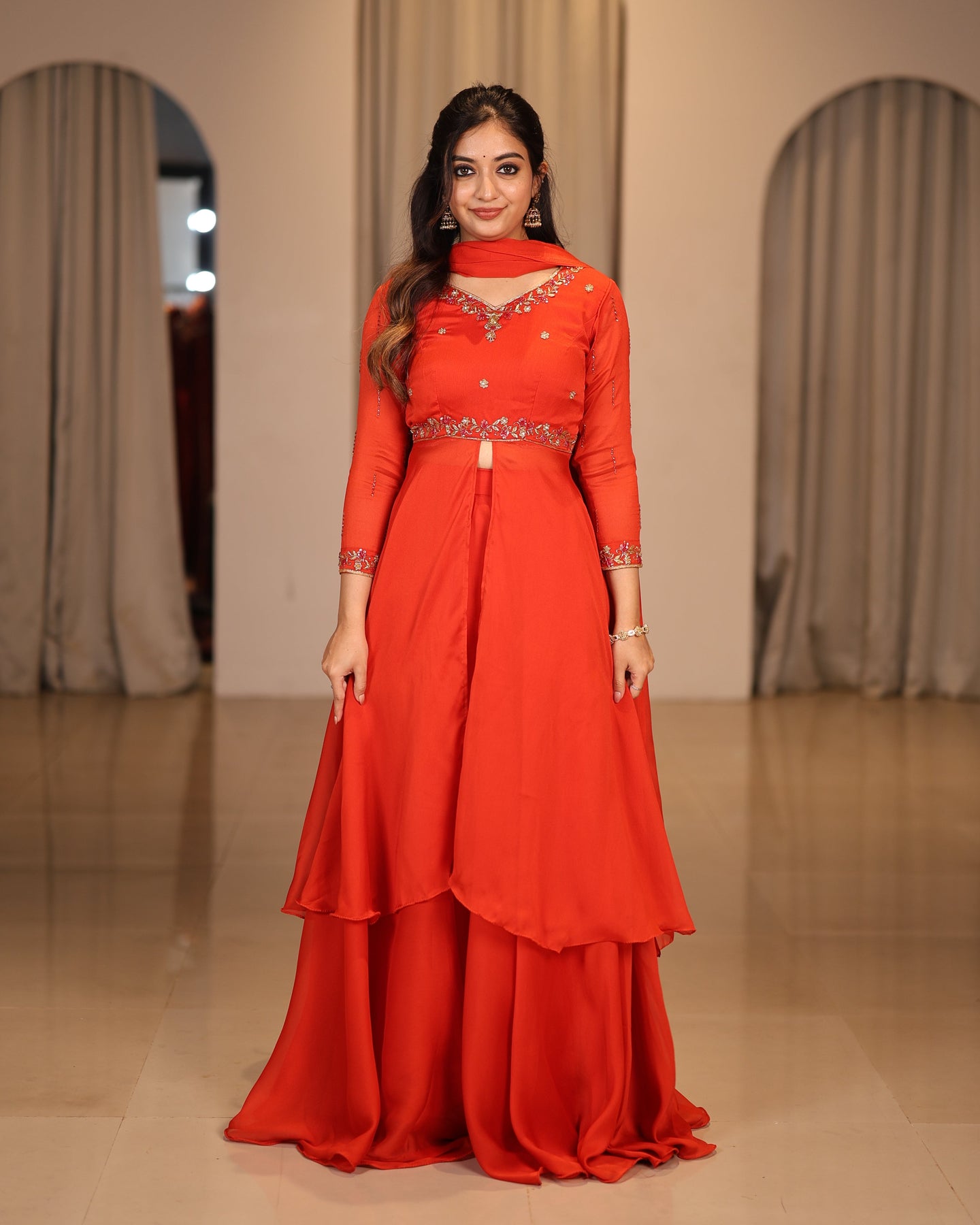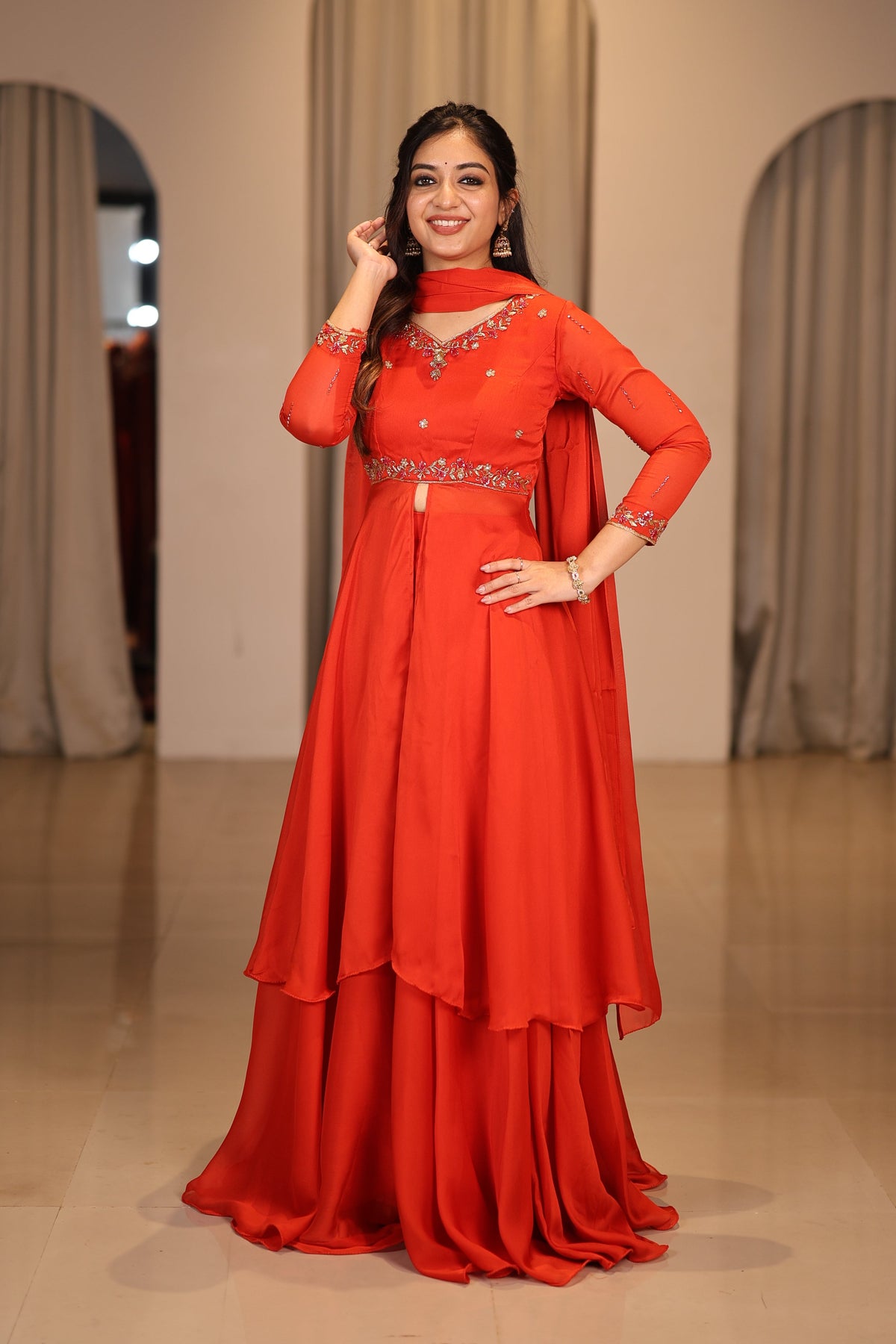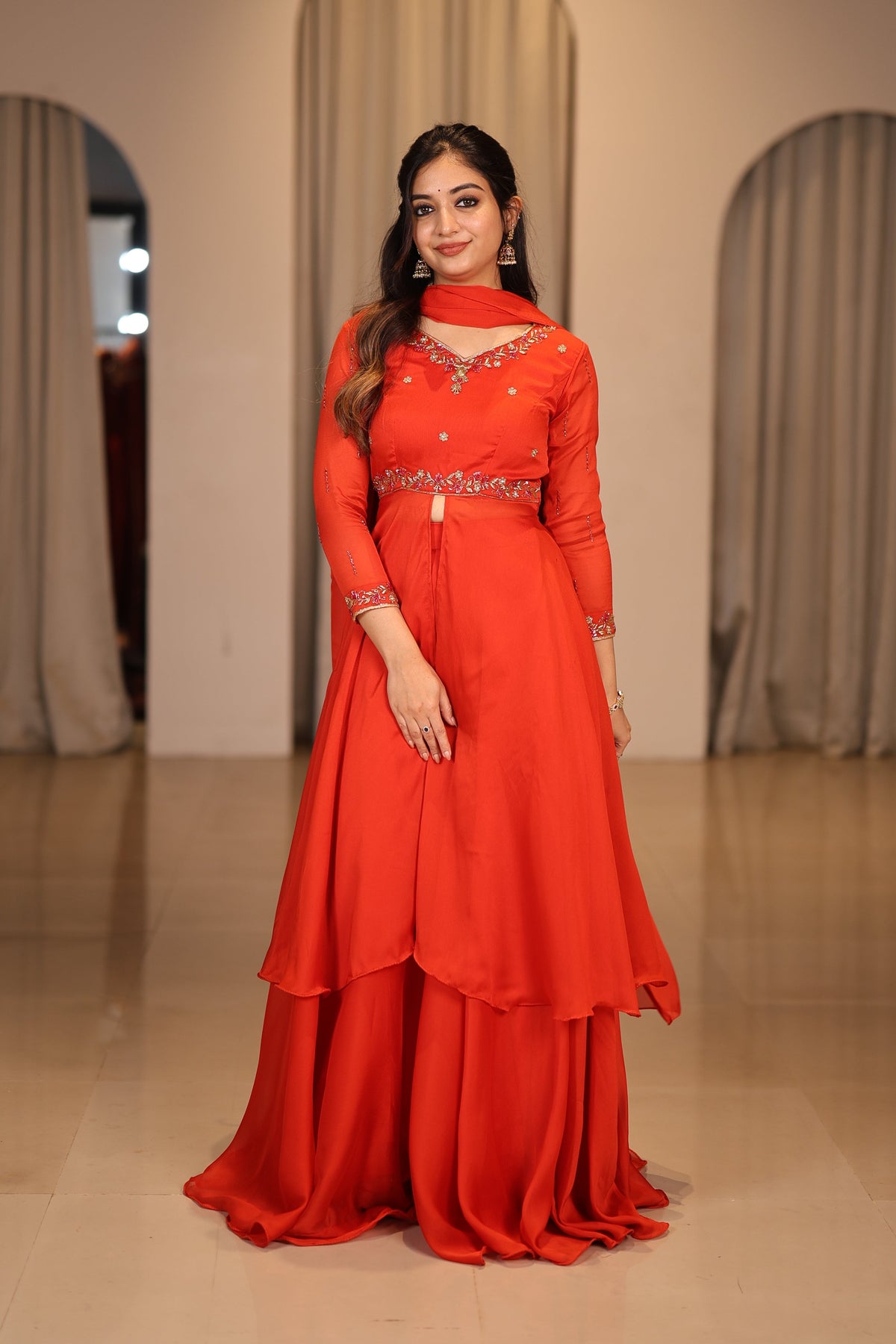 Radiate charm and confidence in this vibrant tangy orange peplum dress crafted from glossy georgette. The long peplum silhouette flows gracefully, creating a modern yet elegant festive look.