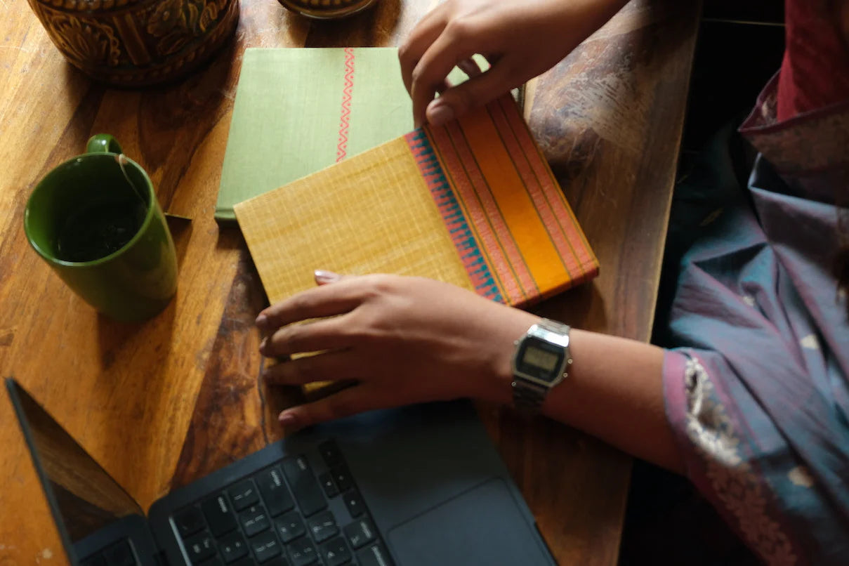 Discover the perfect blend of elegance and tradition with our exquisite aesthetic notebook, featuring a stunning sungudi handloom cotton saree as its outer cover. Crafted for those who appreciate artistry and sophistication.