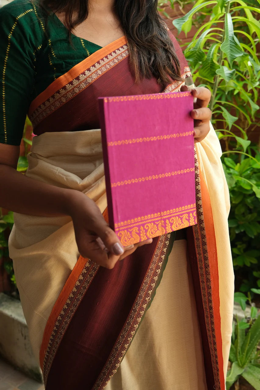 Discover the perfect blend of elegance and tradition with our exquisite aesthetic notebook, featuring a stunning sungudi handloom cotton saree as its outer cover. Crafted for those who appreciate artistry and sophistication.