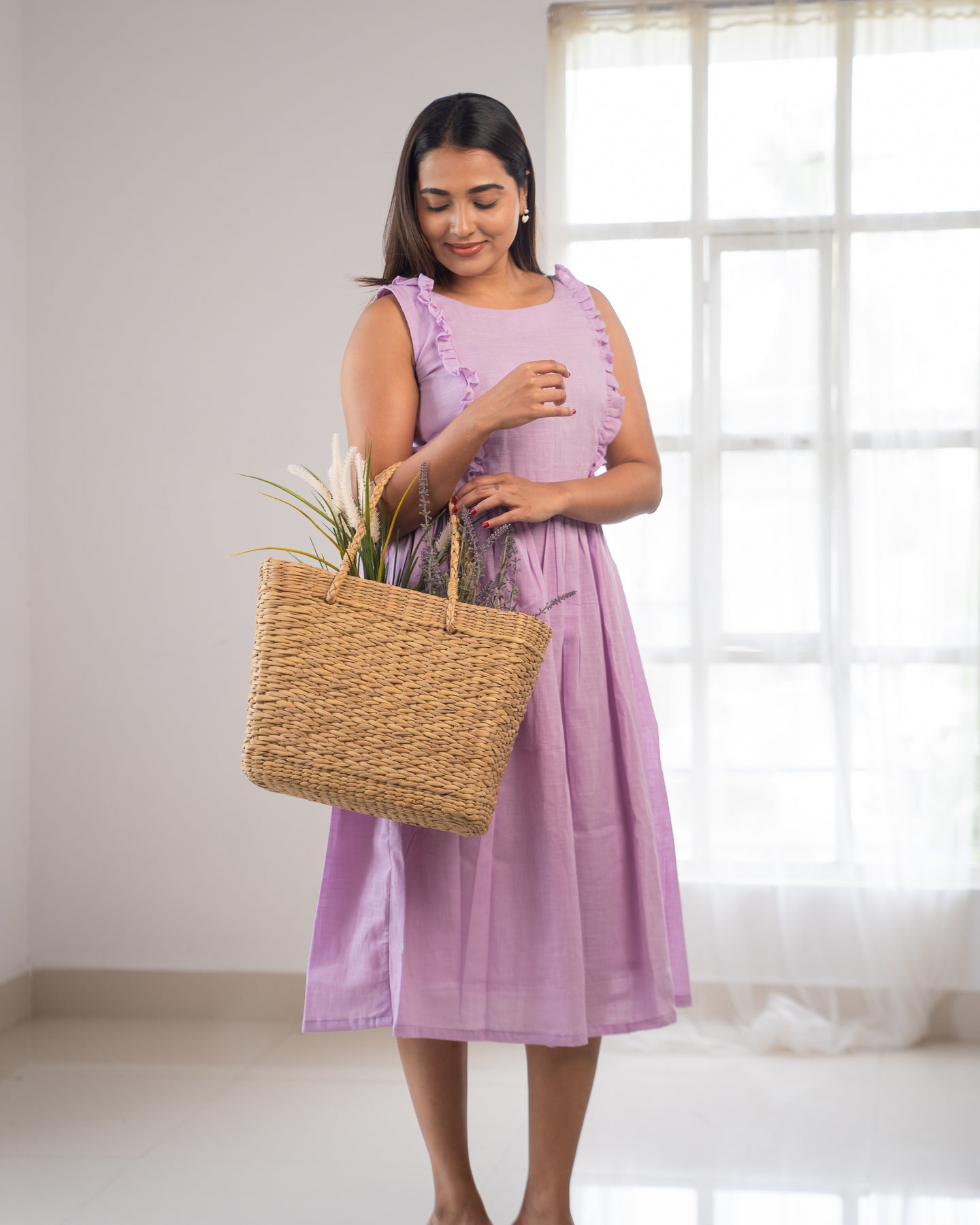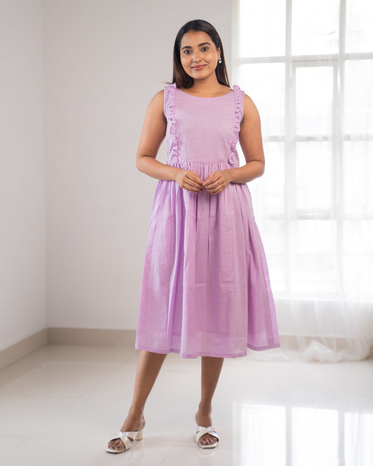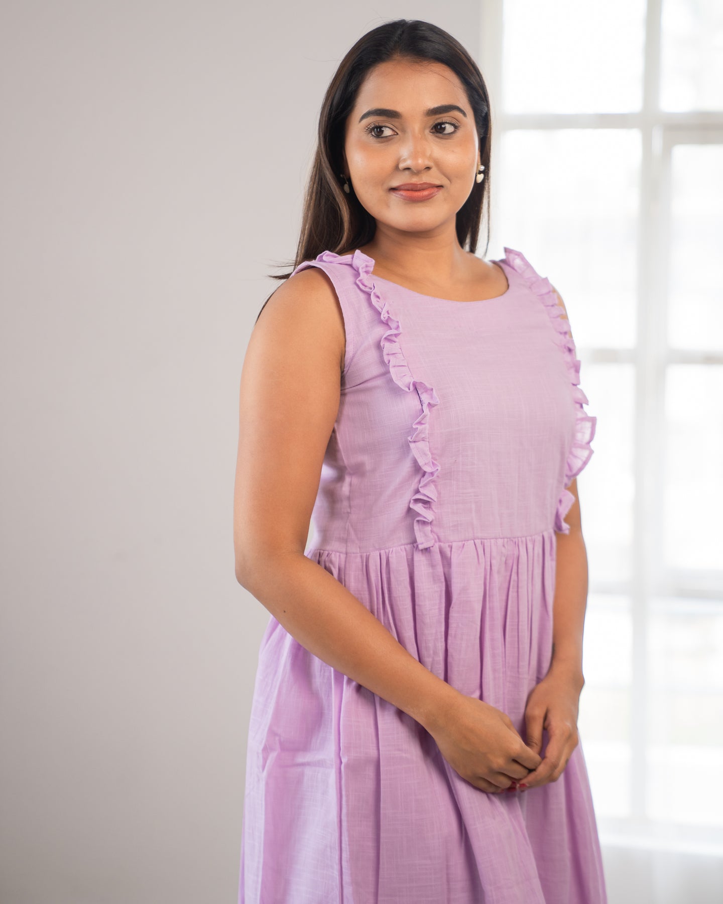 A lovely pastel shade, a monotone fabric, cute sleeveless look, cuter frills