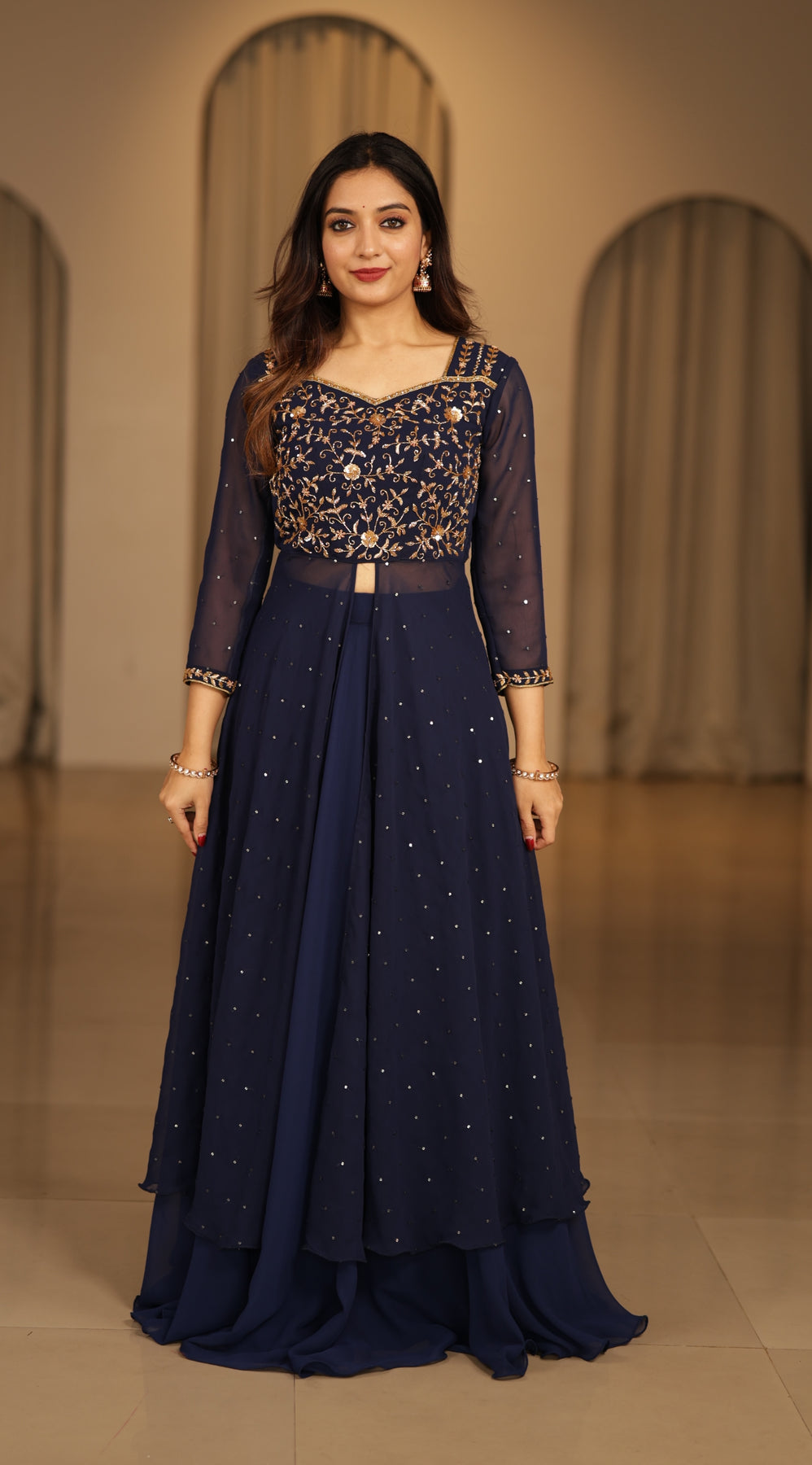 The sequin-embellished peplum top adds a subtle shimmer, while the plain flowing skirt keeps the look refined and graceful—ideal for festive celebrations and evening occasions.