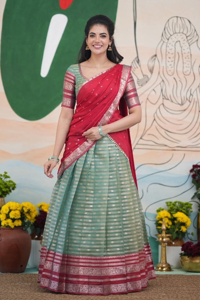 Note : The dhavani colour and border colour will be slightly (upto 10%) different as they are both of different fabrics and weaves. We make sure to give you the closest match that uplifts the look of the whole halfsaree.