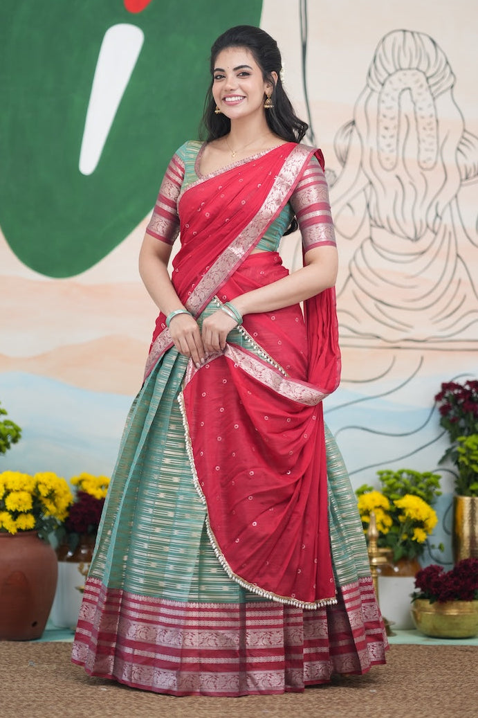 Two Tone Dark Green and Red Organza Half saree