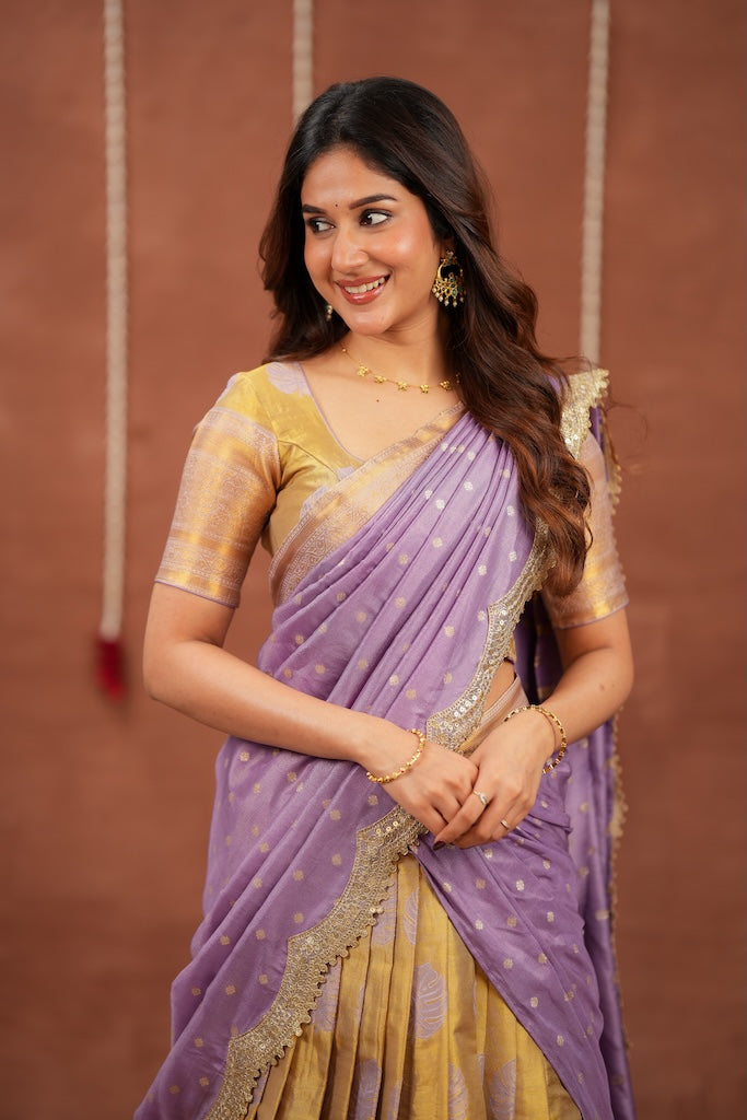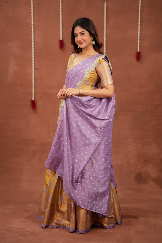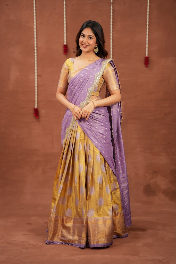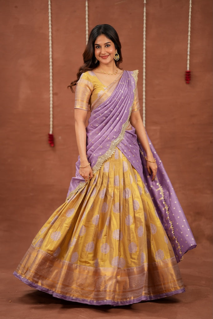 The Mandana Lavender Halfsaree is a statement of opulence and timeless elegance, designed for occasions that call for grandeur. Crafted in rich brocade with silk blend, this ensemble features a luminous mustard gold lehenga adorned with zari-woven buttas, paired with a structured blouse and an elegant teal draped dhavani.