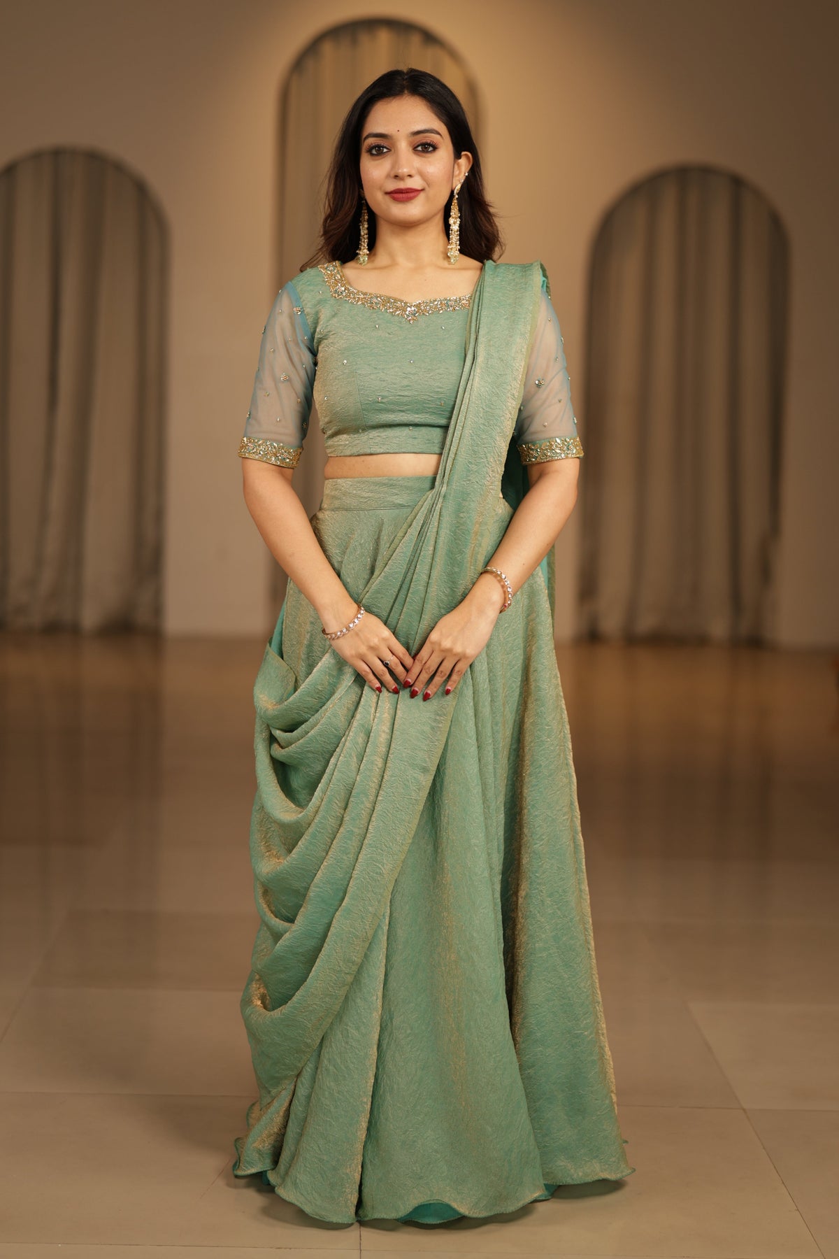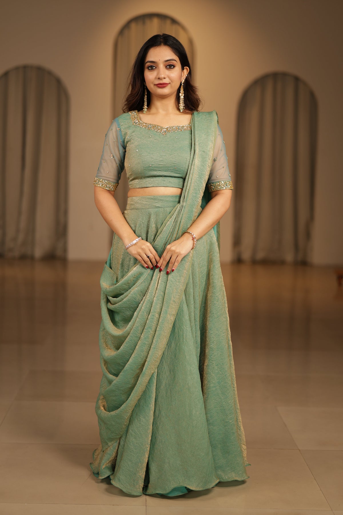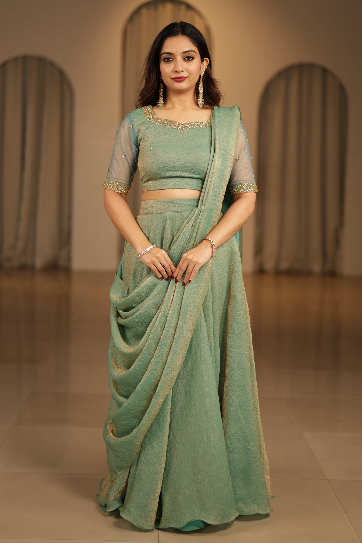 Netted sleeves adorned with intricate embroidery add a delicate touch, while the flowing drape design lends effortless sophistication, making it perfect for festive gatherings and special occasions.