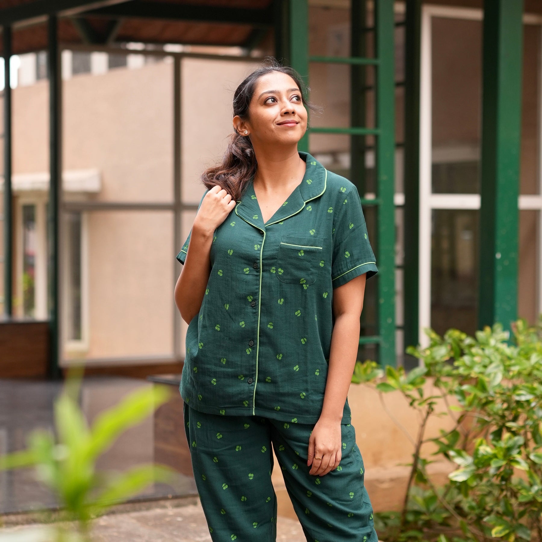 Experience relaxed elegance with these Emerald Green Muslin Pyjamas, crafted from soft, breathable muslin that feels feather-light on the skin. The design features a charming all-over clover motif that adds a subtle touch of personality. A classic revere collar nightwear outlined with bright contrast piping enhances the refined look, while the half sleeves keep it cool and comfortable for warm weather. Finished with a neatly piped pocket, this set blends style and comfort effortlessly—perfect for lounging or peaceful sleep.