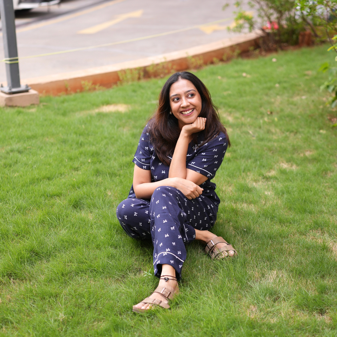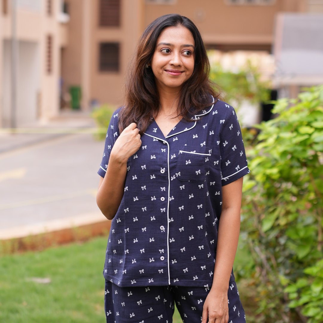Stay stylish and comfortable with our Midnight Navy Muslin Pyjama Set for women. Made from lightweight, breathable cotton muslin fabric, this women’s nightwear includes a shirt & pant set in elegant navy with white bow prints. Perfect as sleepwear, lounge wear, or a night suit for women, it offers a relaxed fit and all-night comfort.