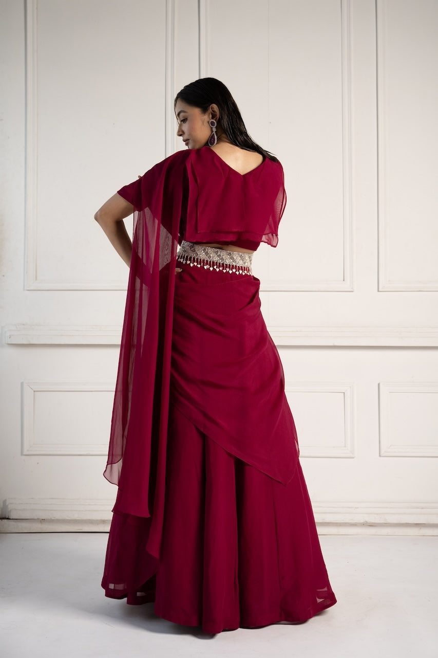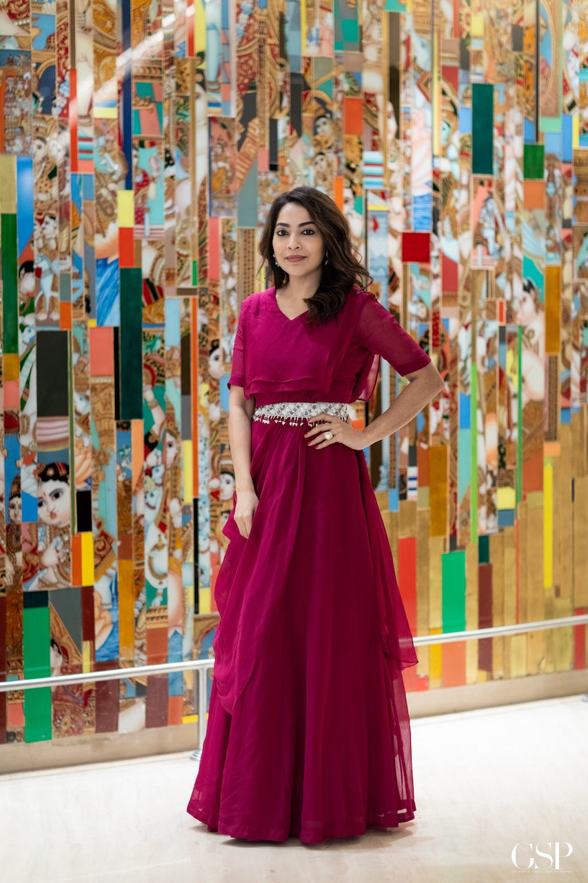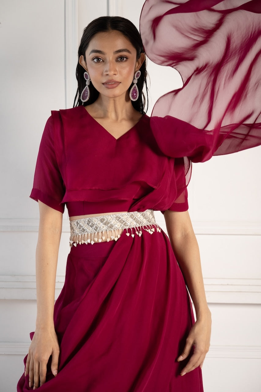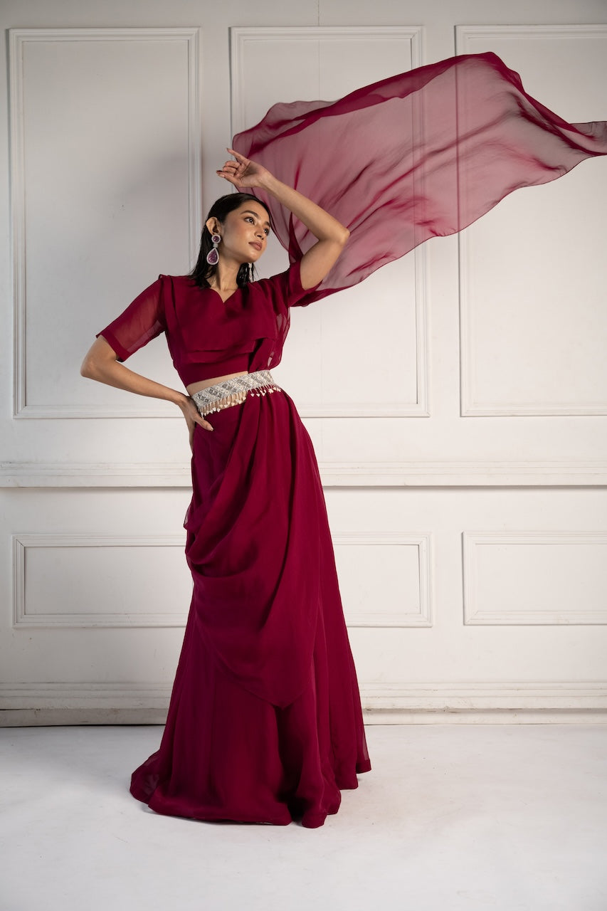 Elevate your festive look with this Organza Saree, a pre-draped masterpiece that echoes traditional charm. It is paired perfectly with hand embroidered belt.