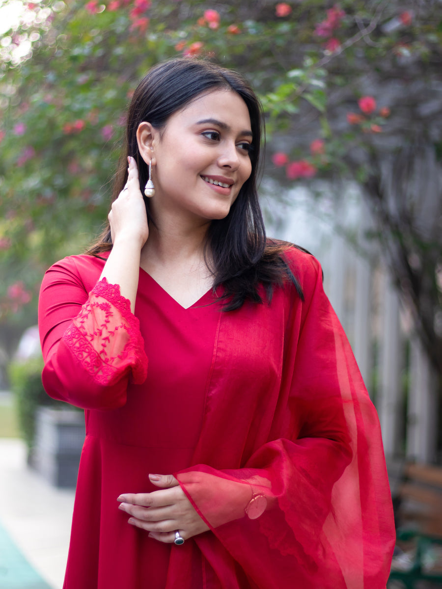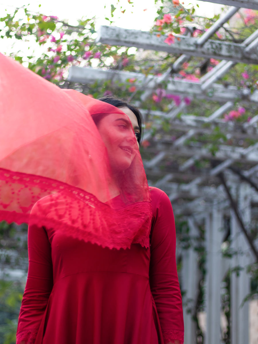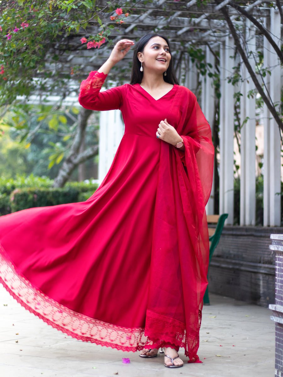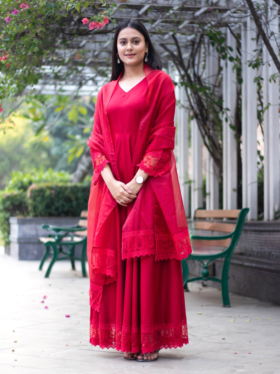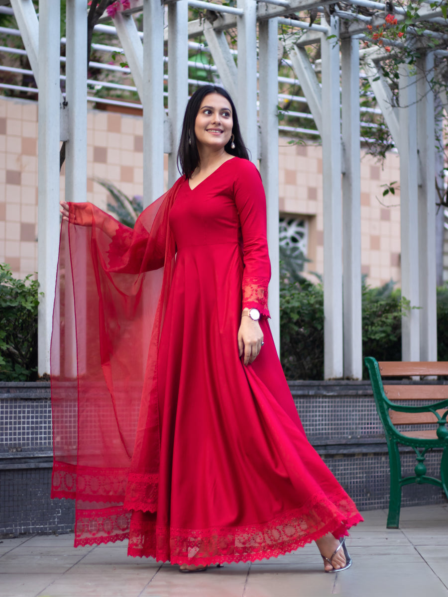 Flattering Circular cut gown and organza dupatta with beautiful embroidered lace borders. A perfect feminine outfit for subtle occasions!