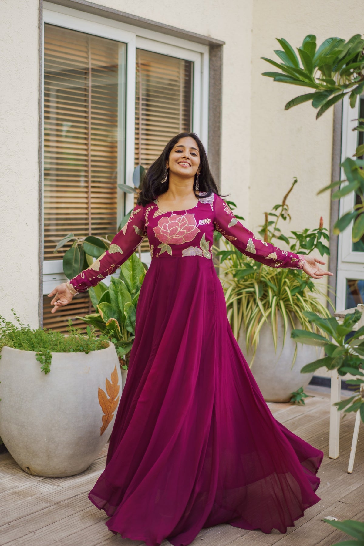 Beautiful vibrant pinkish purple flared dress with colourful floral gold embroidered yoke. This soft, flowy georgette dress in flattering fit is a must-have! Lining provided.