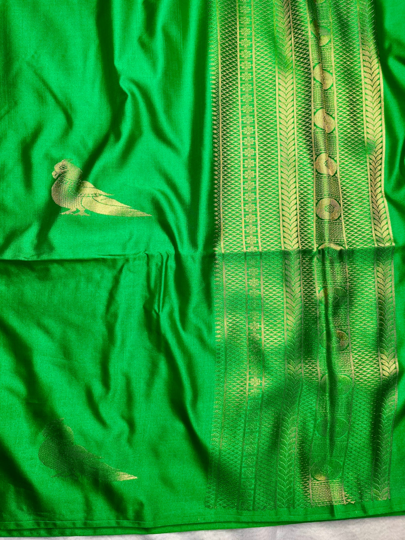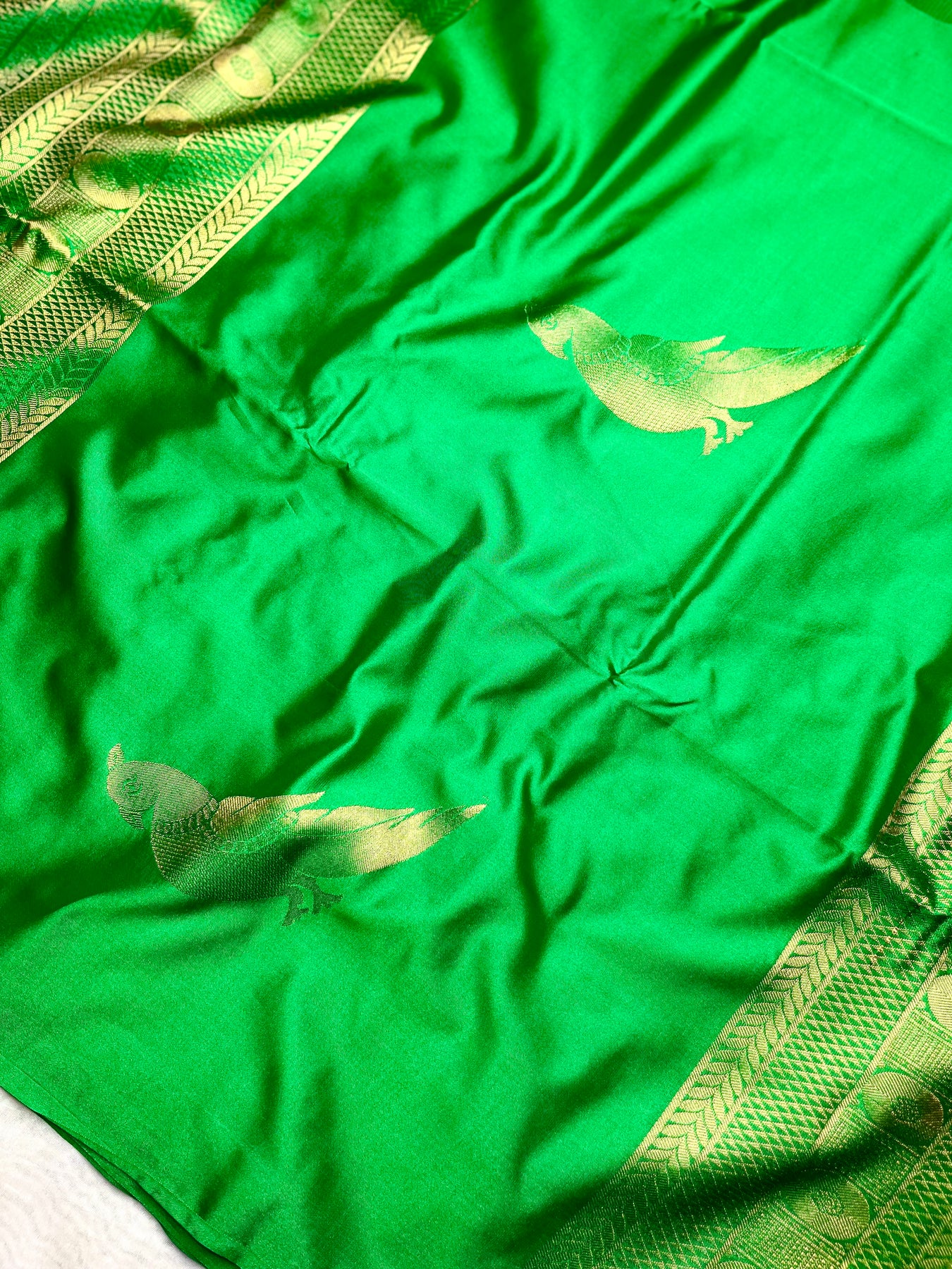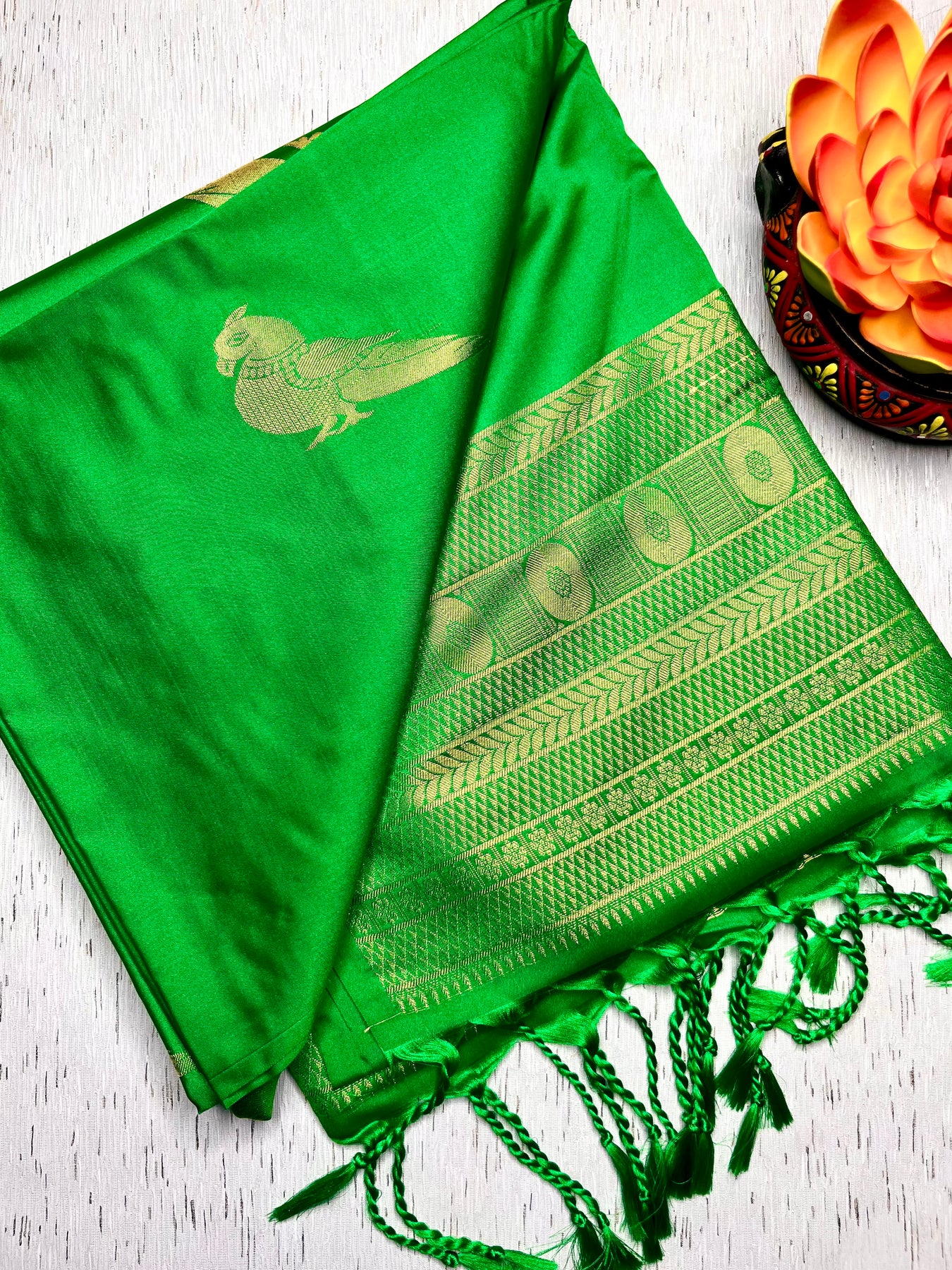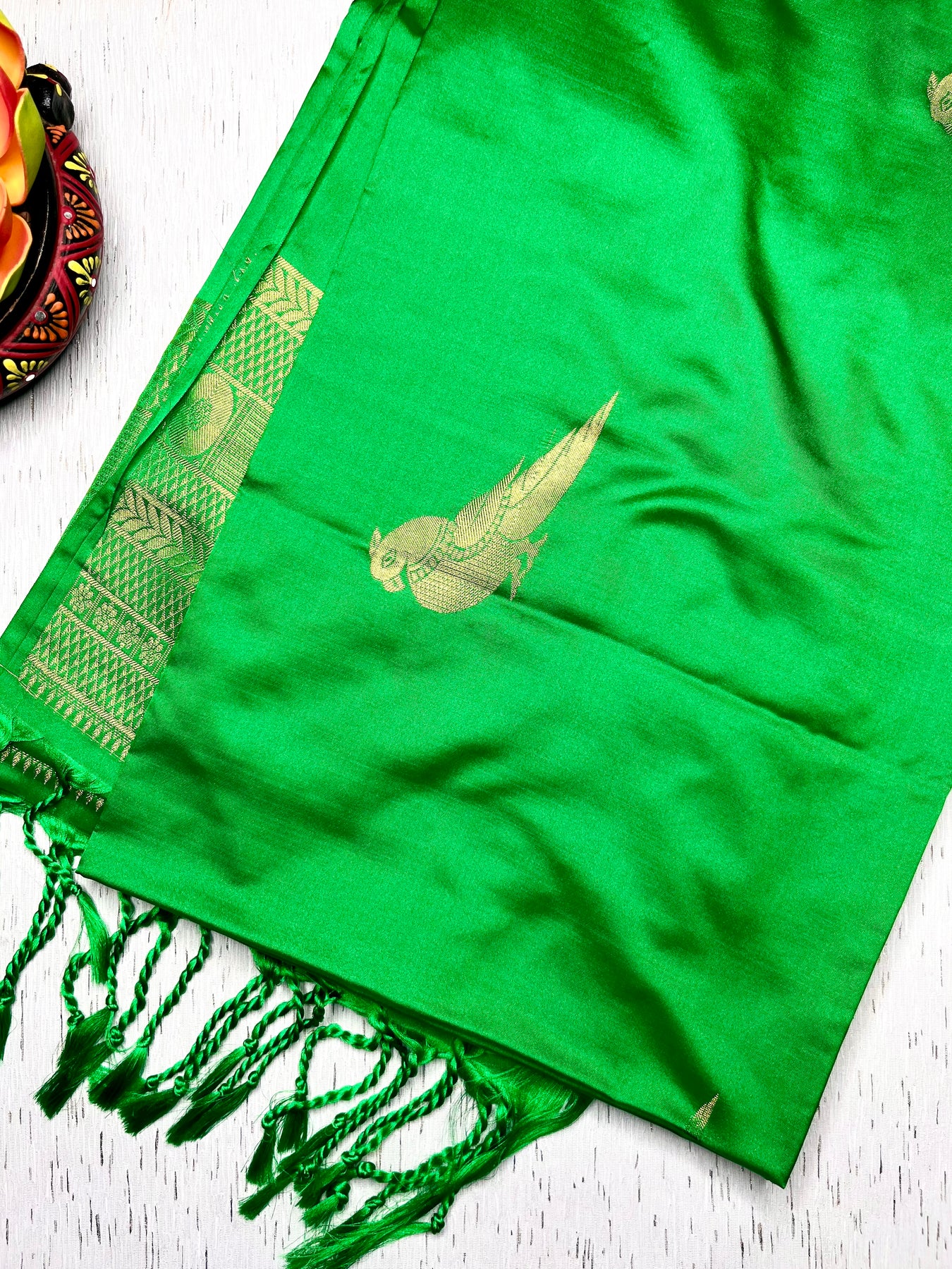 Drape yourself in elegance with this exquisite Kanchi Soft Silk Saree in a stunning forest green color, featuring delicate parrot patterns all over the body. The graceful zari pallu adds a touch of grandeur, perfectly paired with a matching fgreen color blouse. A timeless piece that blends tradition with sophistication, perfect for festive and special occasions.