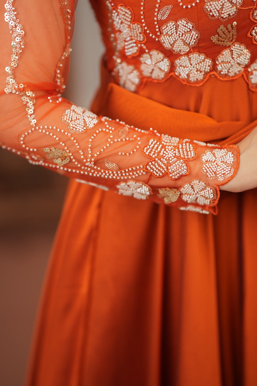 The designer beadwork on the yoke and sleeves adds a touch of shimmer and sophistication, while the ruffled hemline enhances the feminine charm.