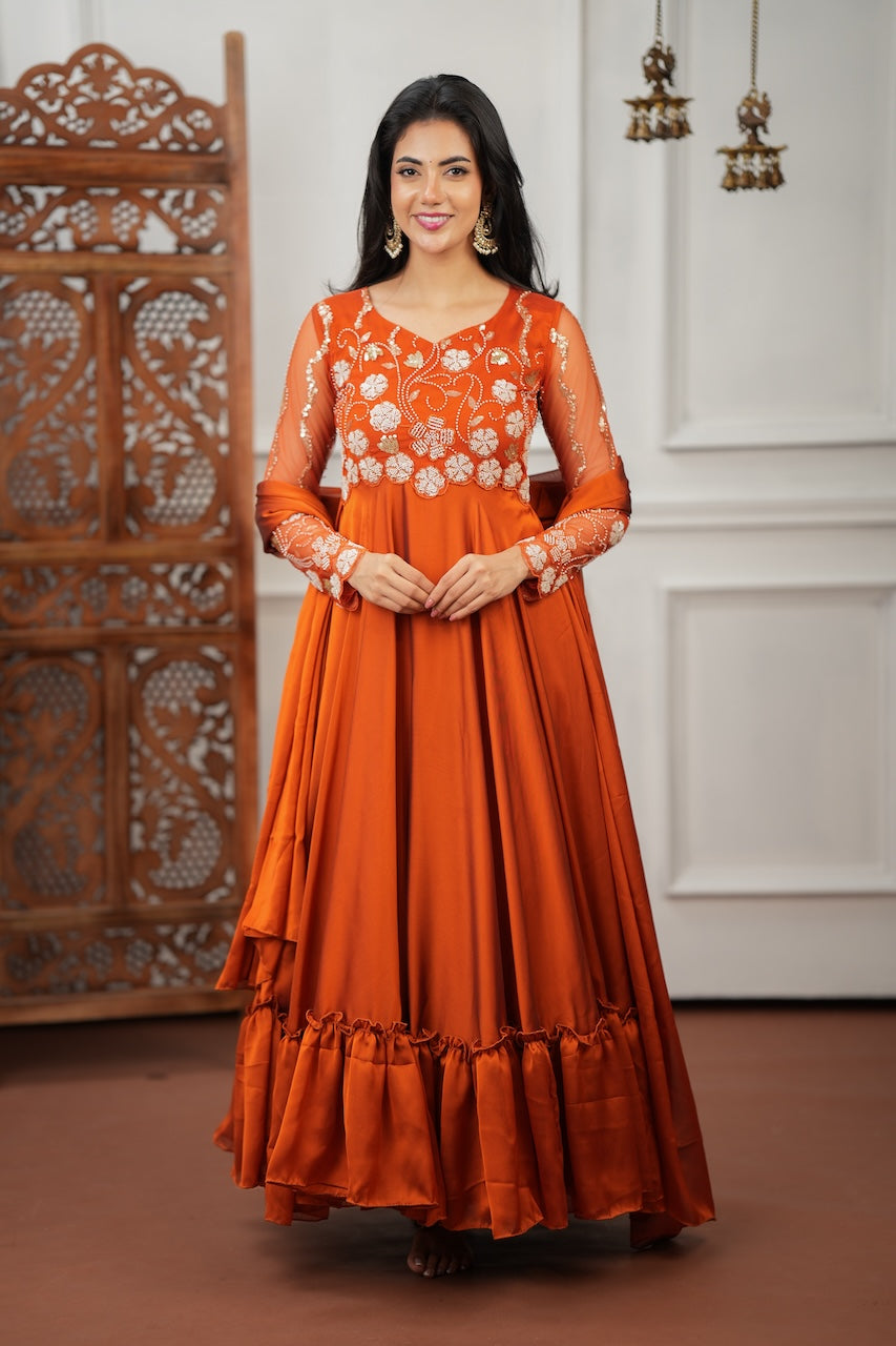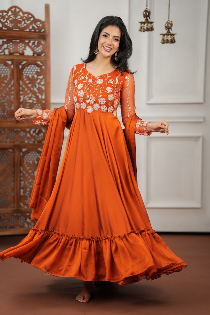 A statement of grace and detail — this full-sleeved Anarkali is crafted in glossy georgette that flows beautifully with every step.