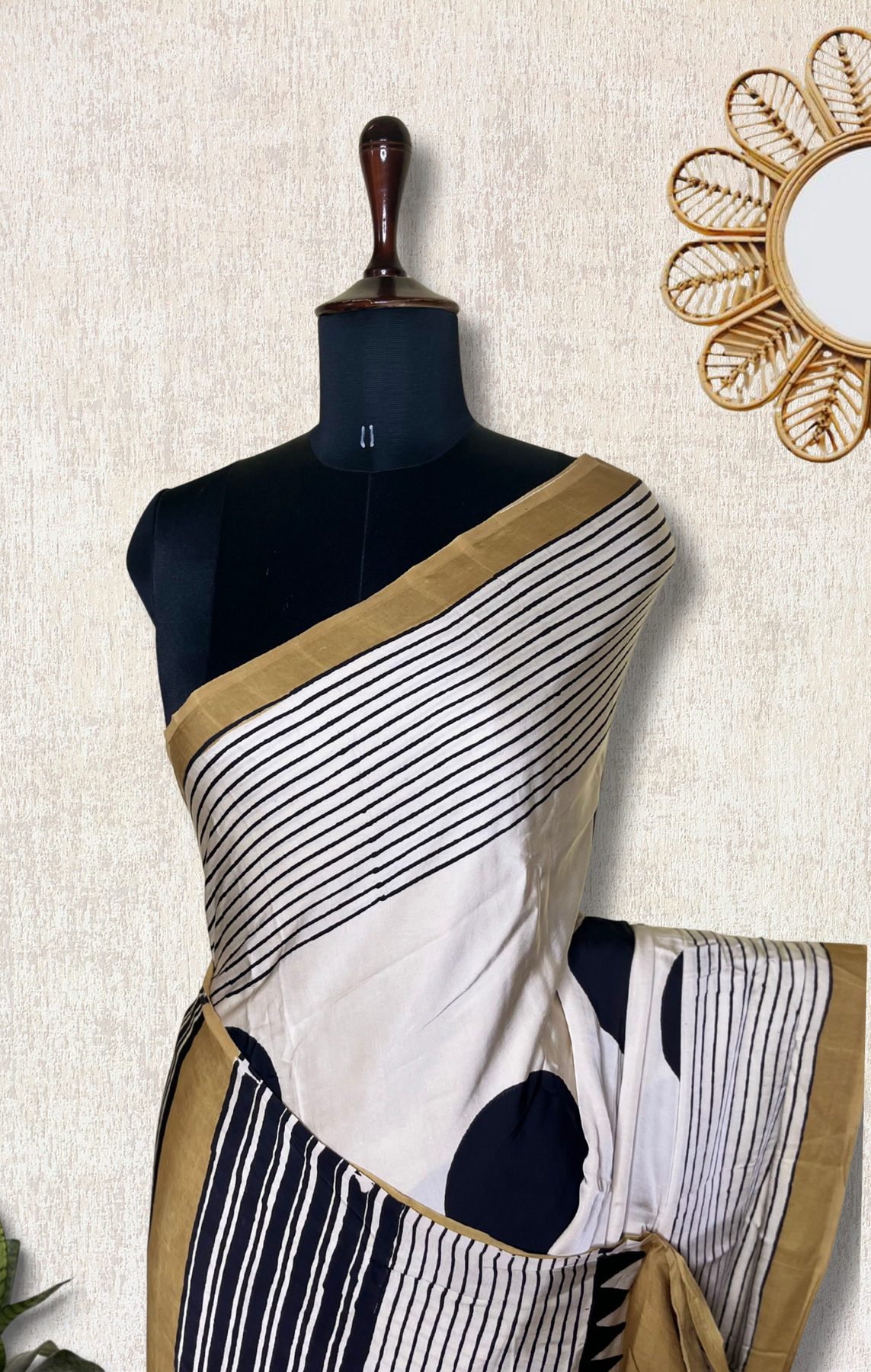 Ajrakh Modal Silk Hand Block Printed Saree - Elite Cream + Black