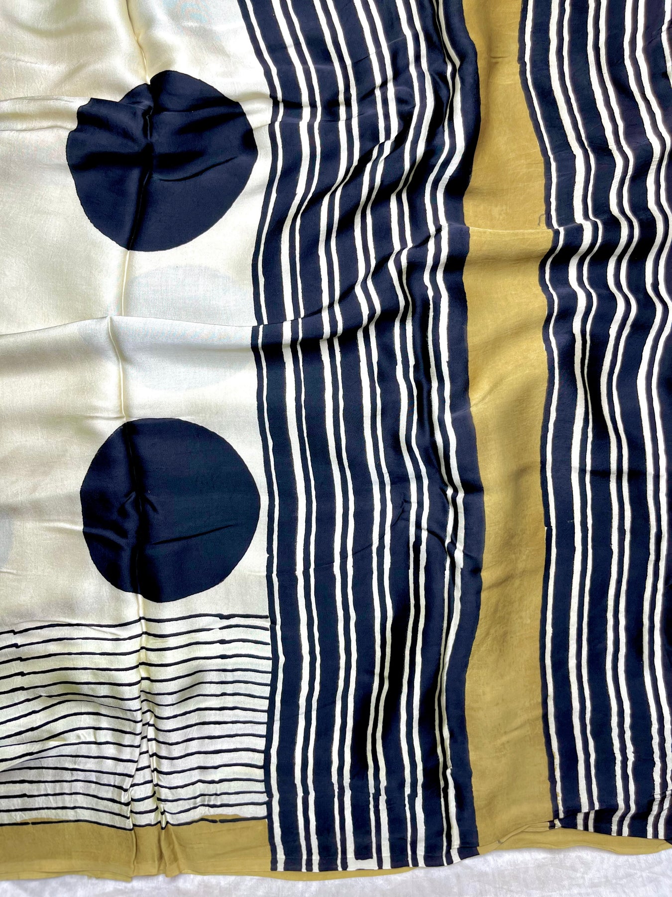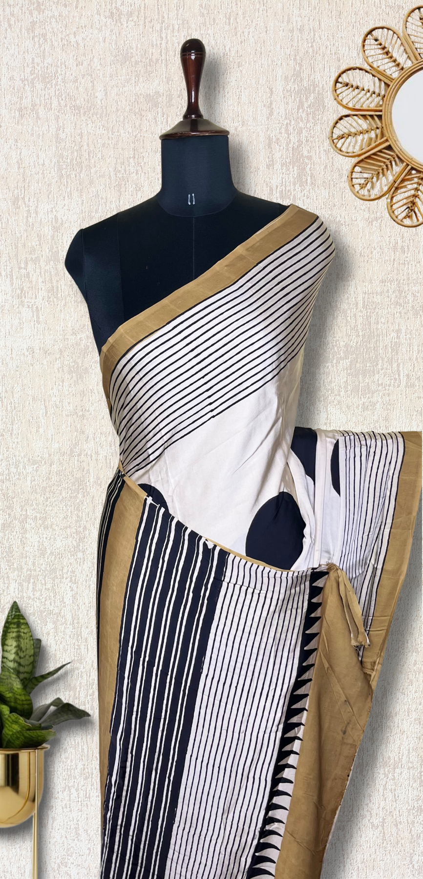 Fabric : Modal Silk Dimensions : 6.3 meters x 45 inch comes with running blouse - 0.8 meters. Colour : Elite Cream + Black Blouse colour : Contrast Polka Blouse Care Instructions :Dry clean only Store saree in a muslin cloth away from sunlight in a dry environment. Air the textile every few months.