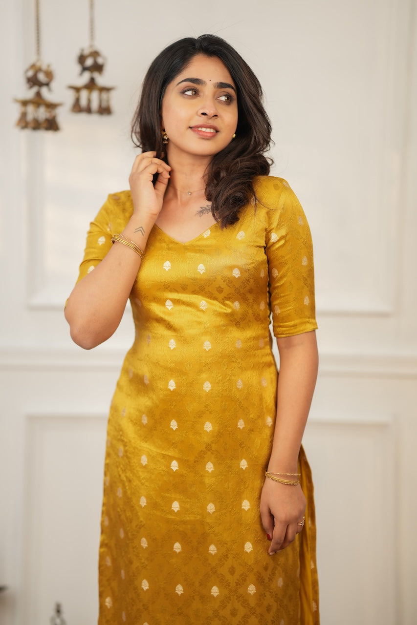 The Ayra Gold Co-Ord Set is an elegant fusion of minimal design and festive charm. Tailored in shimmer brocade silk with subtle zari buttis, this straight kurta paired with slim-fit pants offers both comfort and regality. Perfect for semi-formal gatherings, wedding functions, and festive evenings, Ayra brings understated luxury in a golden hue that never goes out of style.