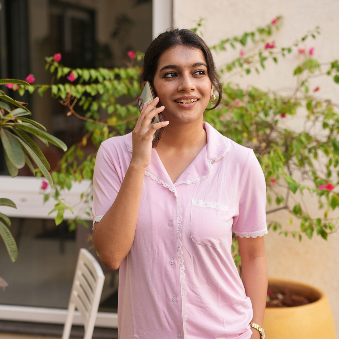 Add a sweet charm to your nights with our Candy Pink Bamboo Pyjama Set — designed for nightwear, loungewear, and sleepwear. Crafted from smooth, breathable bamboo fabric, it ensures all-night comfort and freshness. The revere collar and short sleeves give it a chic, relaxed vibe, while the contrast red lace work adds a playful yet elegant touch. The soft candy pink color sprinkled with tiny strawberry prints brings a cute, refreshing feel — perfect for cozy evenings and blissful sleep.