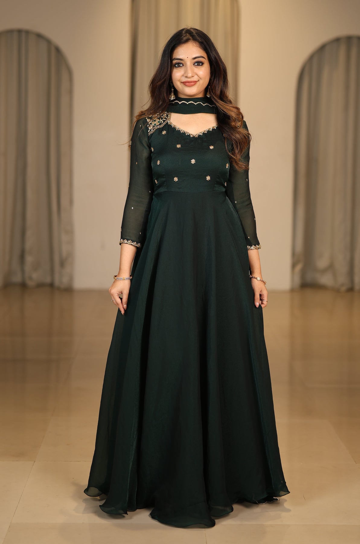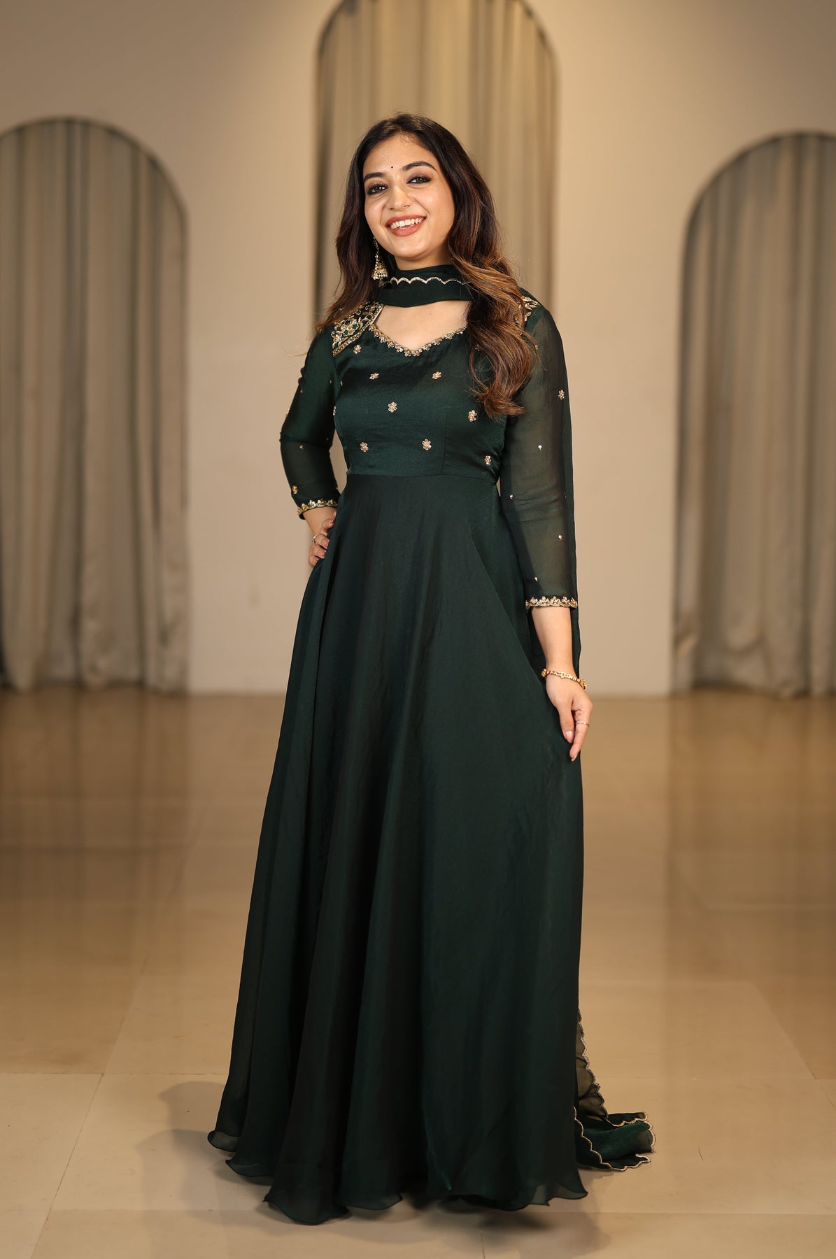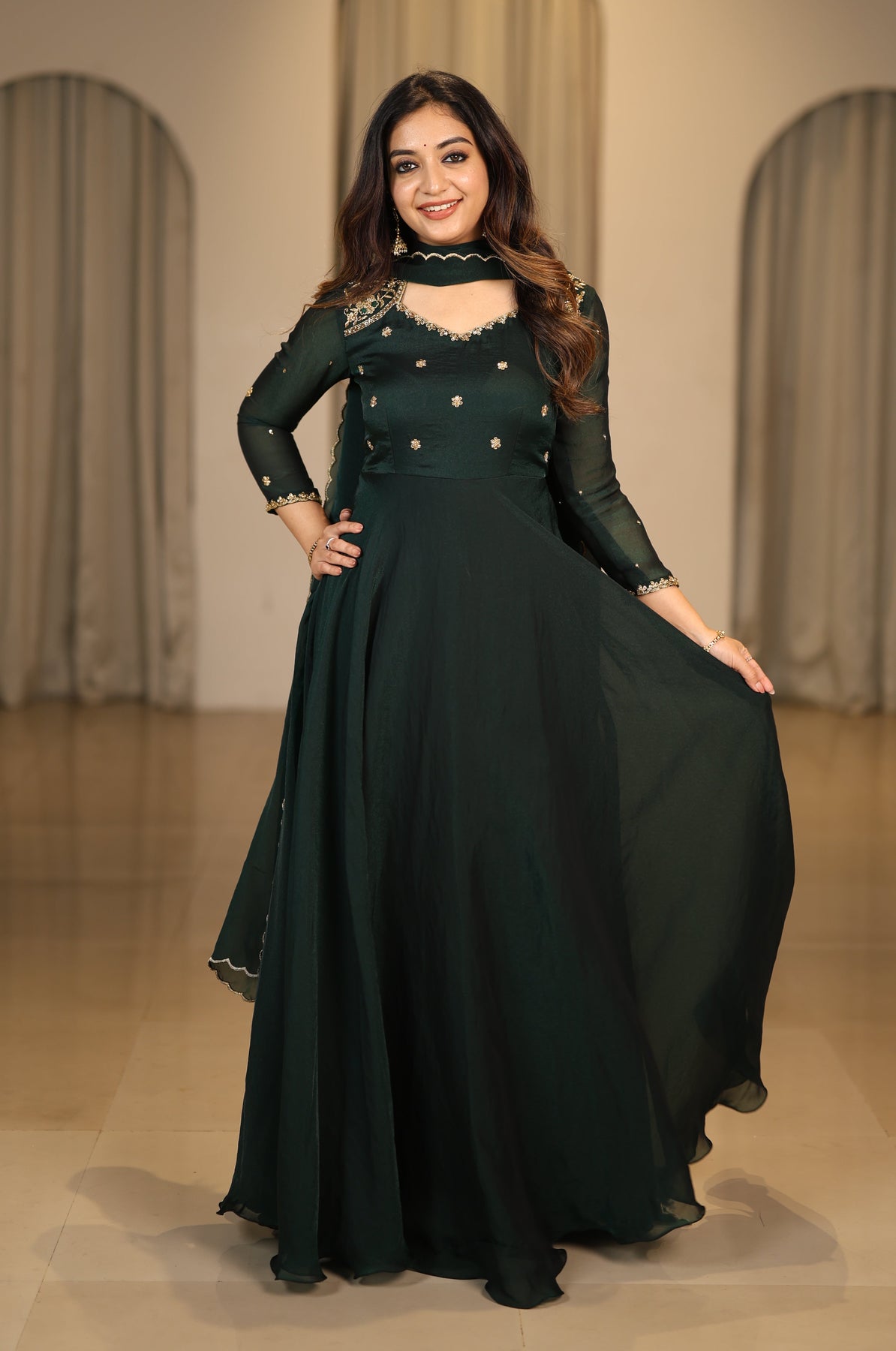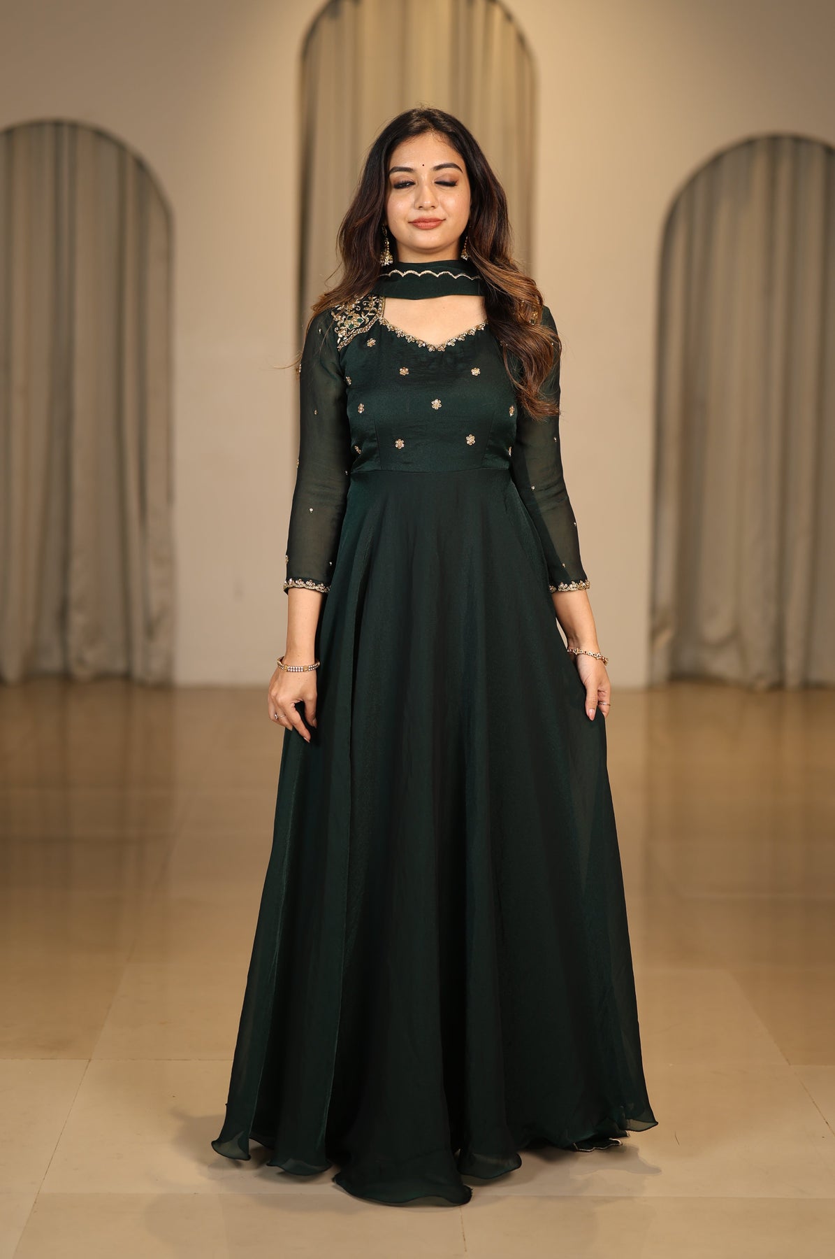 A timeless Anarkali crafted from luxurious silk georgette fabric. Designed with full flare for a regal silhouette, it exudes effortless elegance perfect for festive and traditional occasions.