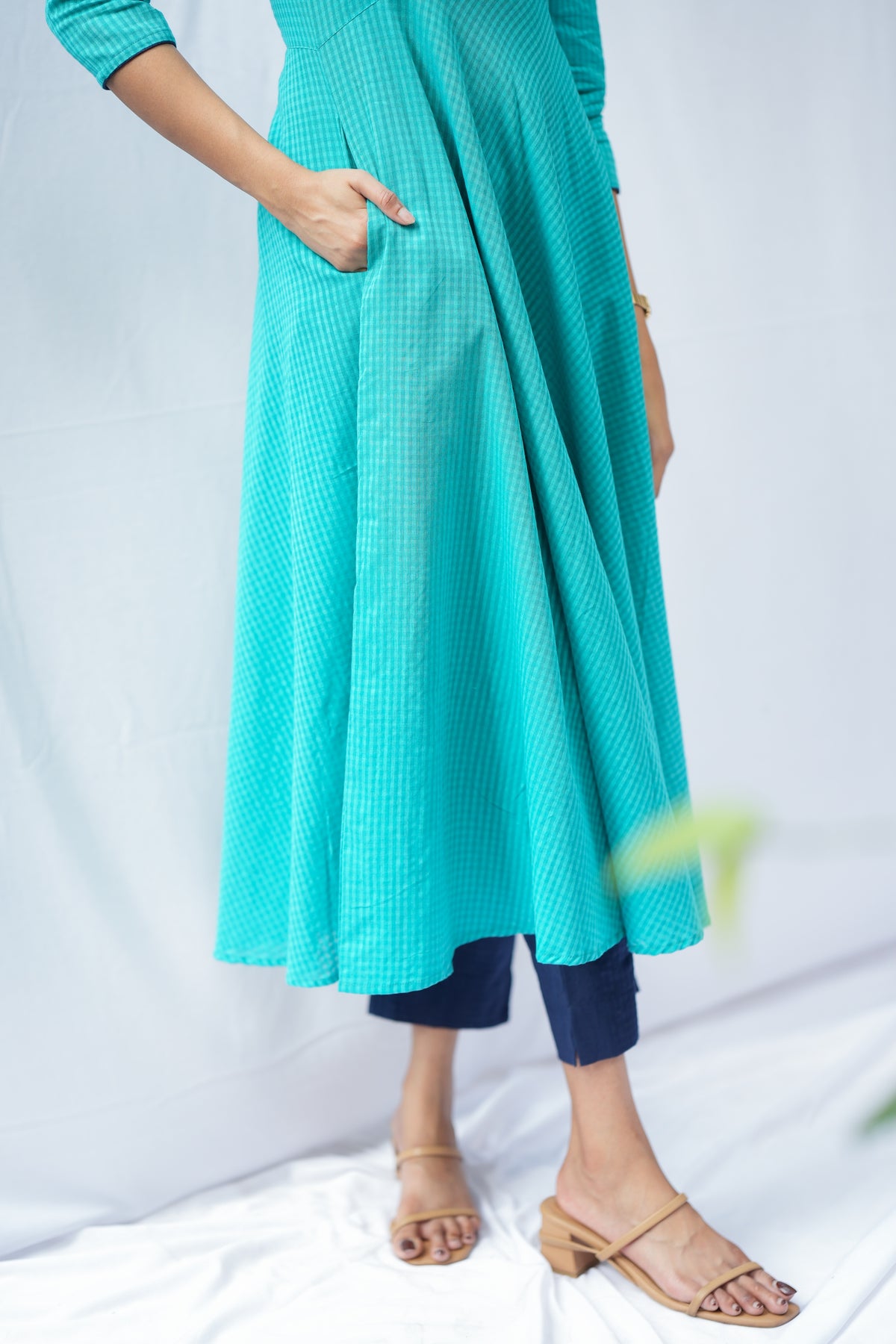 A beautiful teal anarkali kurta featuring delicate self-checks and stunning golden kolam embroidery. The navy blue contrast patch brings a fresh twist to this classic silhouette, while the matching pants create a perfectly coordinated look. A thoughtfully crafted ethnic outfit that makes a graceful statement.