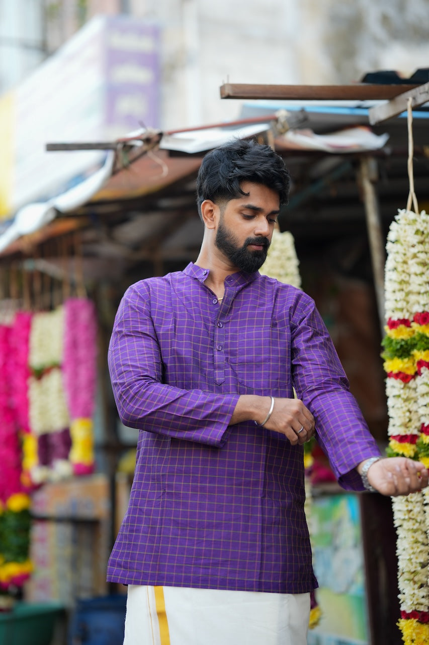 The Maayan Purple Shirt brings together the richness of handloom cotton-silk blend with a woven check pattern that radiates subtle sophistication. Designed with a tailored fit and mandarin collar, this shirt embodies cultural elegance while ensuring everyday comfort. Perfect for Navratri, Diwali, temple festivities, or weddings, its artisanal texture celebrates South Indian heritage with a modern touch.