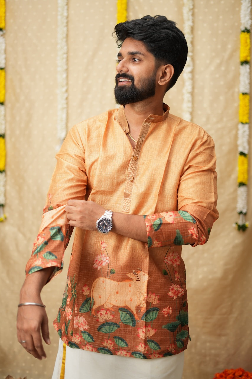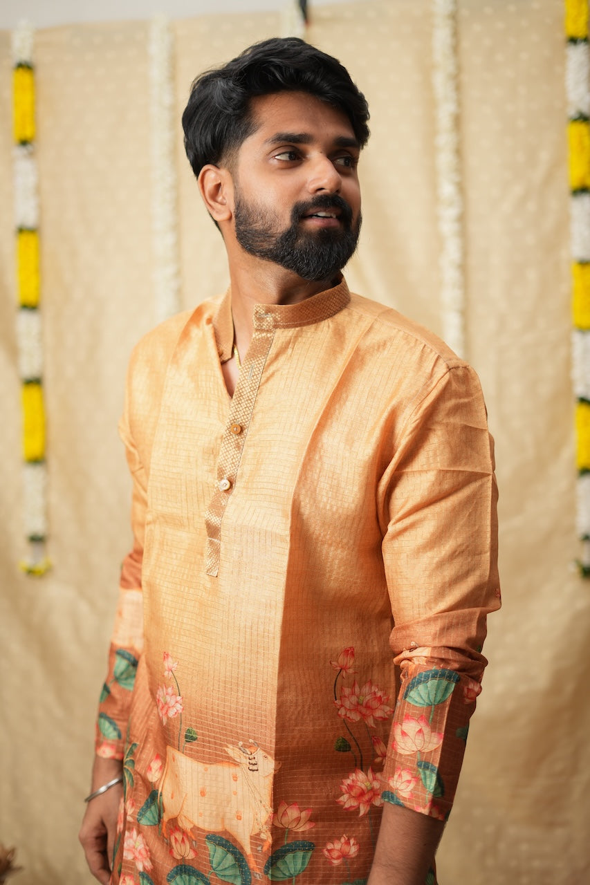 The Nedunchezhian Yellow Shirt is a radiant festive shirt crafted in luxurious dola silk and adorned with Pichwai-inspired lotus artwork. With its mandarin collar, contrast placket, and luminous sheen, this shirt blends traditional artistry with modern tailoring. Perfect for weddings, receptions, poojas, and cultural gatherings, it brings timeless elegance to men’s ethnic wear.